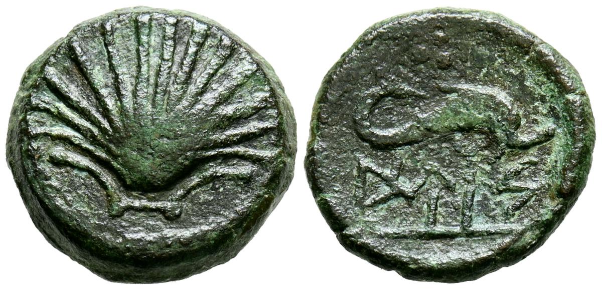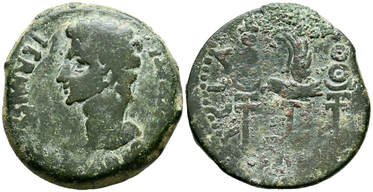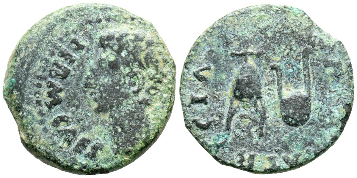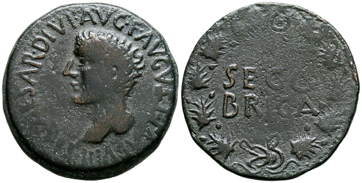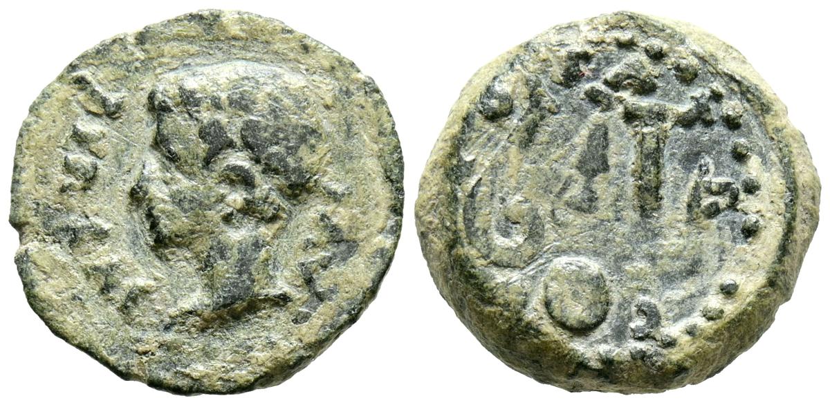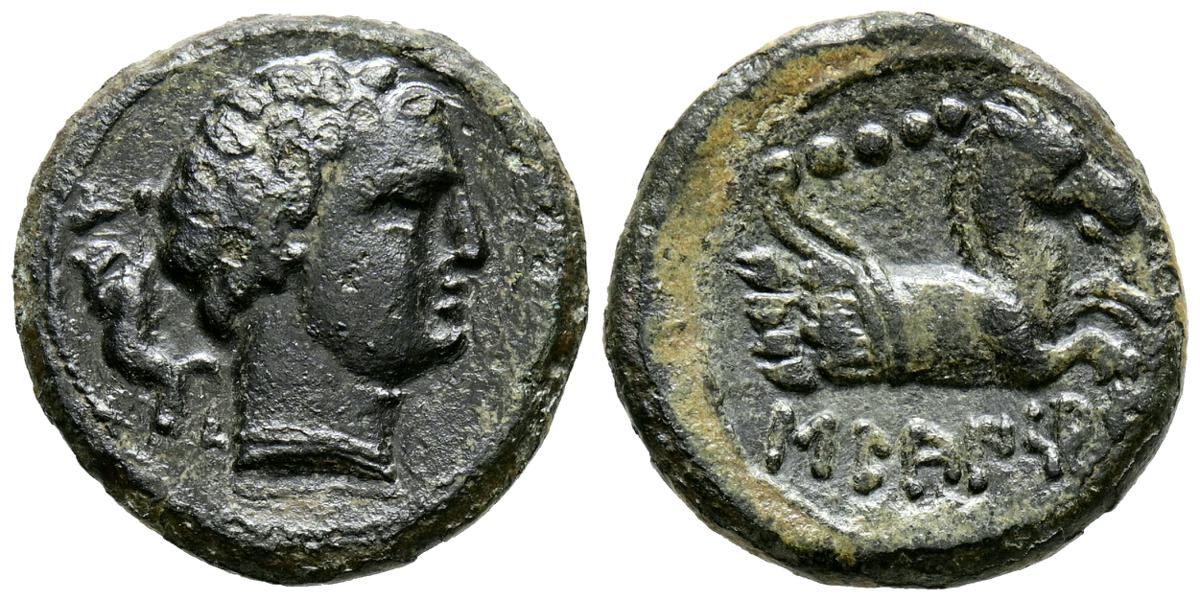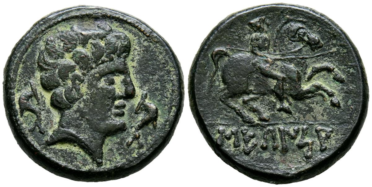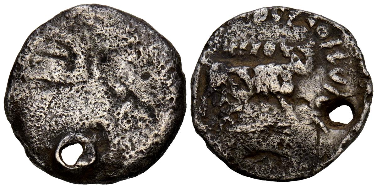 SEGIA, (Ejea de los Caballeros, Zaragoza). As. (Ae. 10,27g/23mm). 120-20 a.C. (FAB-2157). Anv: Cabeza masculina barbada y con collar a derecha, detrás dos delfines. Rev: Jinete lancero a derecha, encima creciente y estrella, debajo sobre línea: SEGIA. MBC-. Curioso ejemplar con aparentes restos de un baño de plata en reverso.