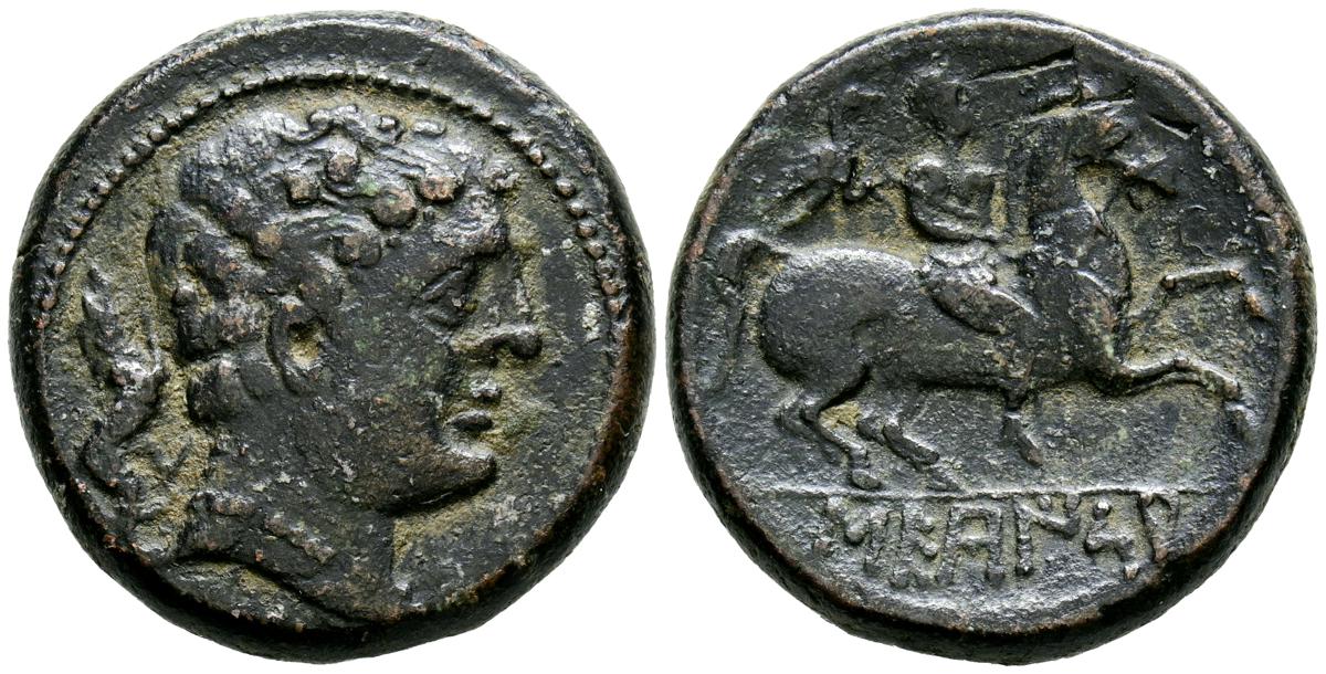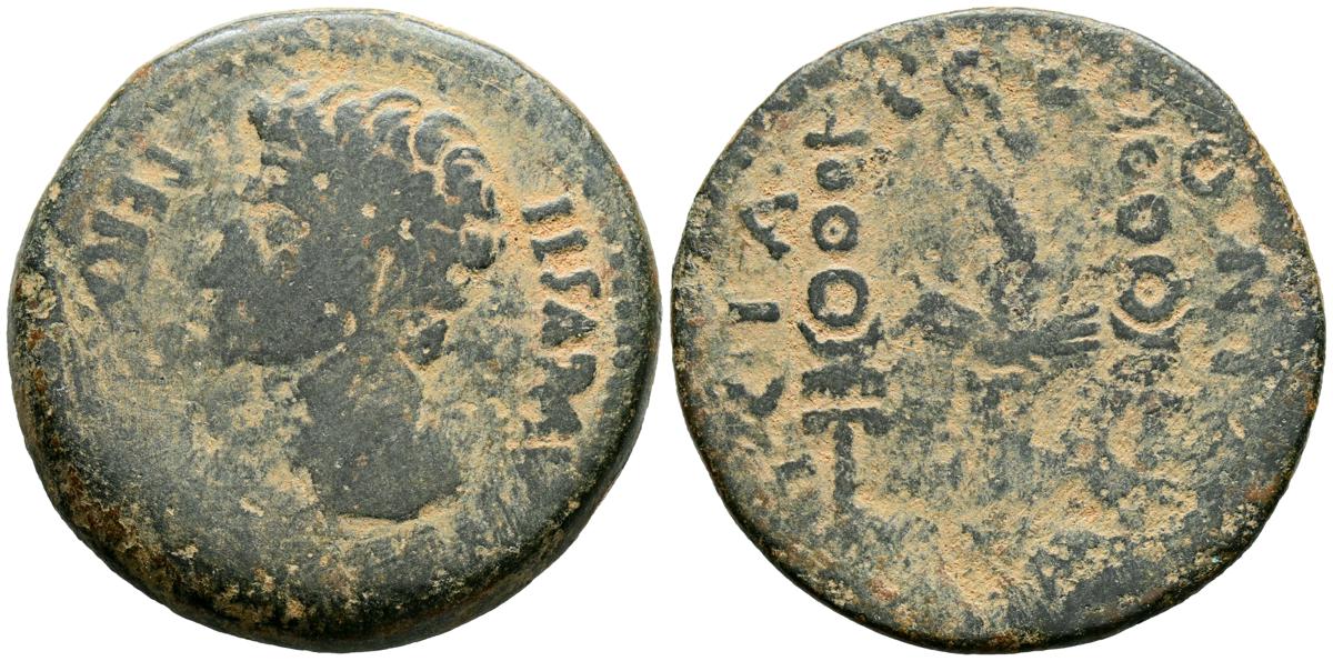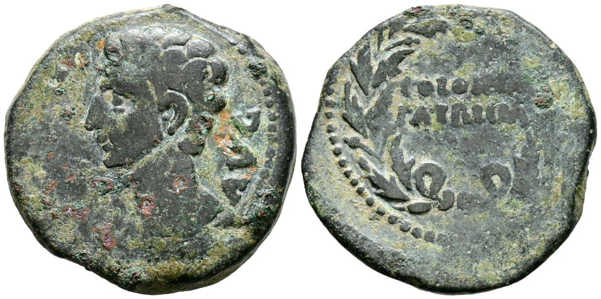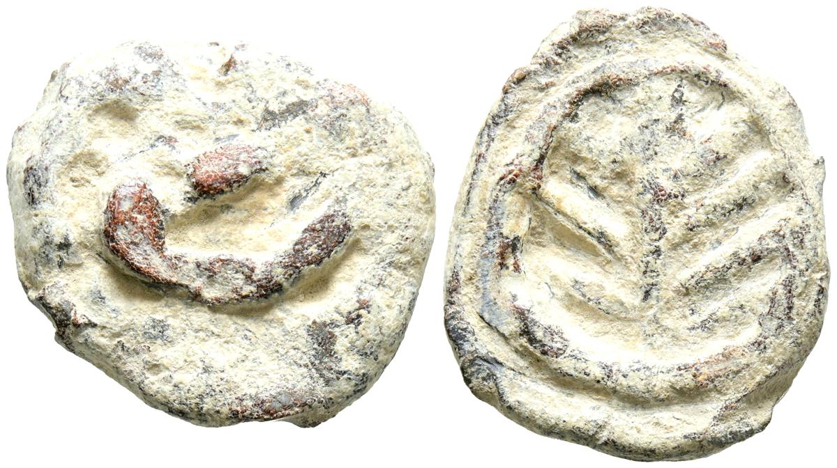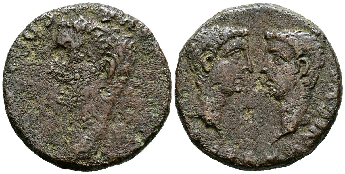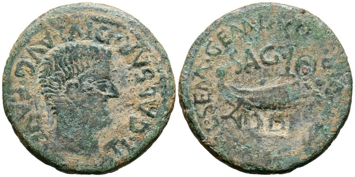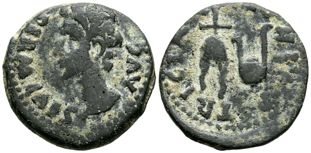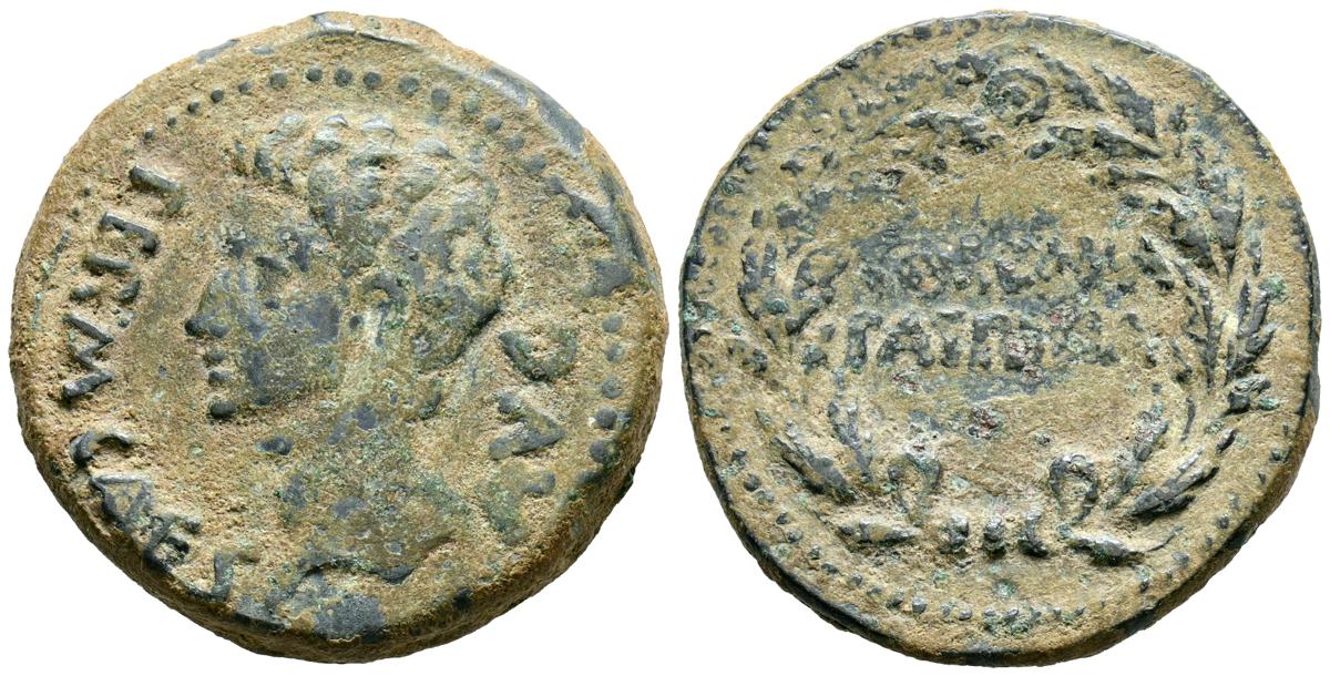 SEGIA, (Ejea de los Caballeros, Zaragoza). As. (Ae. 10,27g/23mm). 120-20 a.C. (FAB-2157). Anv: Cabeza masculina barbada y con collar a derecha, detrás dos delfines. Rev: Jinete lancero a derecha, encima creciente y estrella, debajo sobre línea: SEGIA. MBC-. Curioso ejemplar con aparentes restos de un baño de plata en reverso.