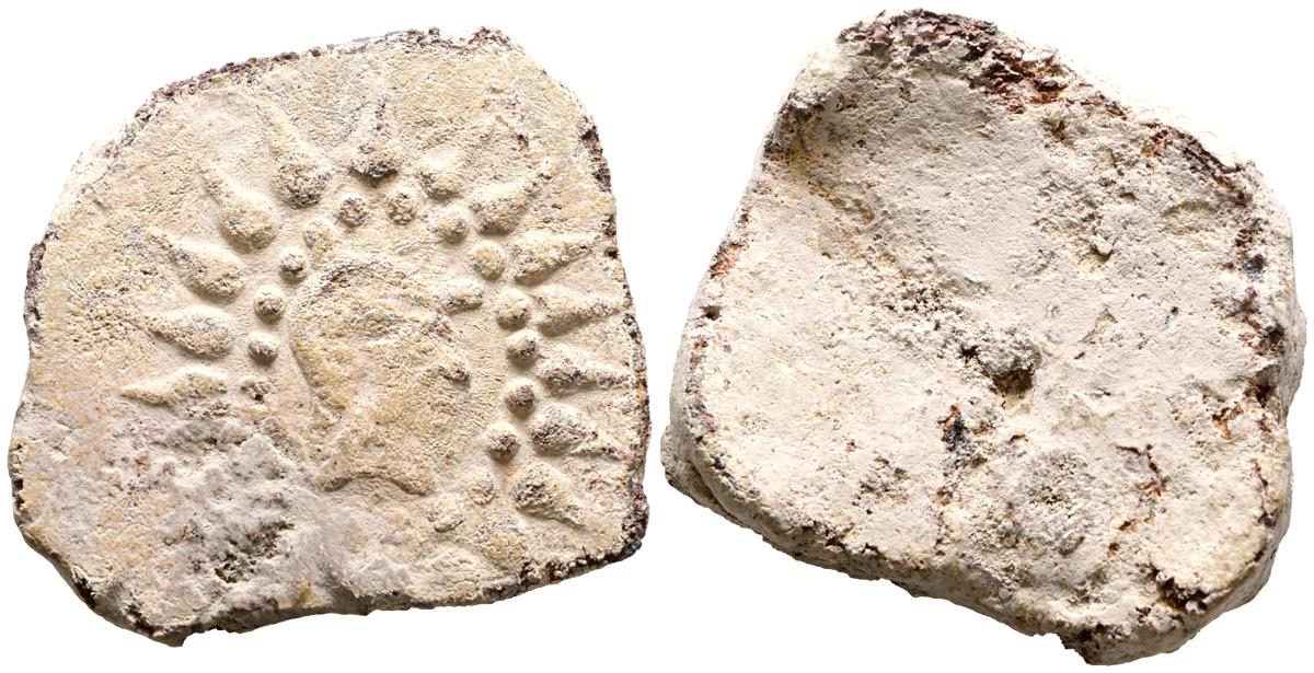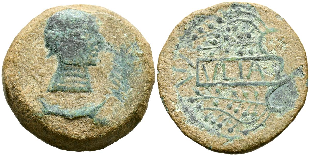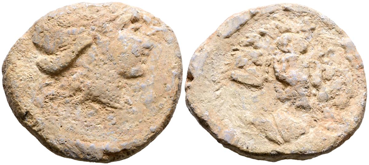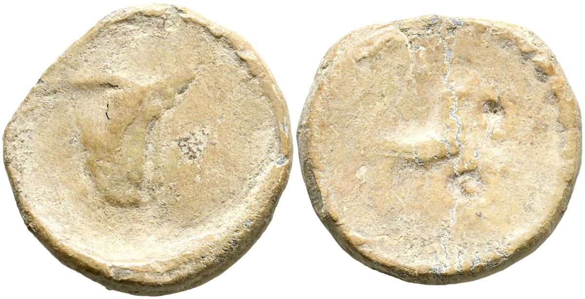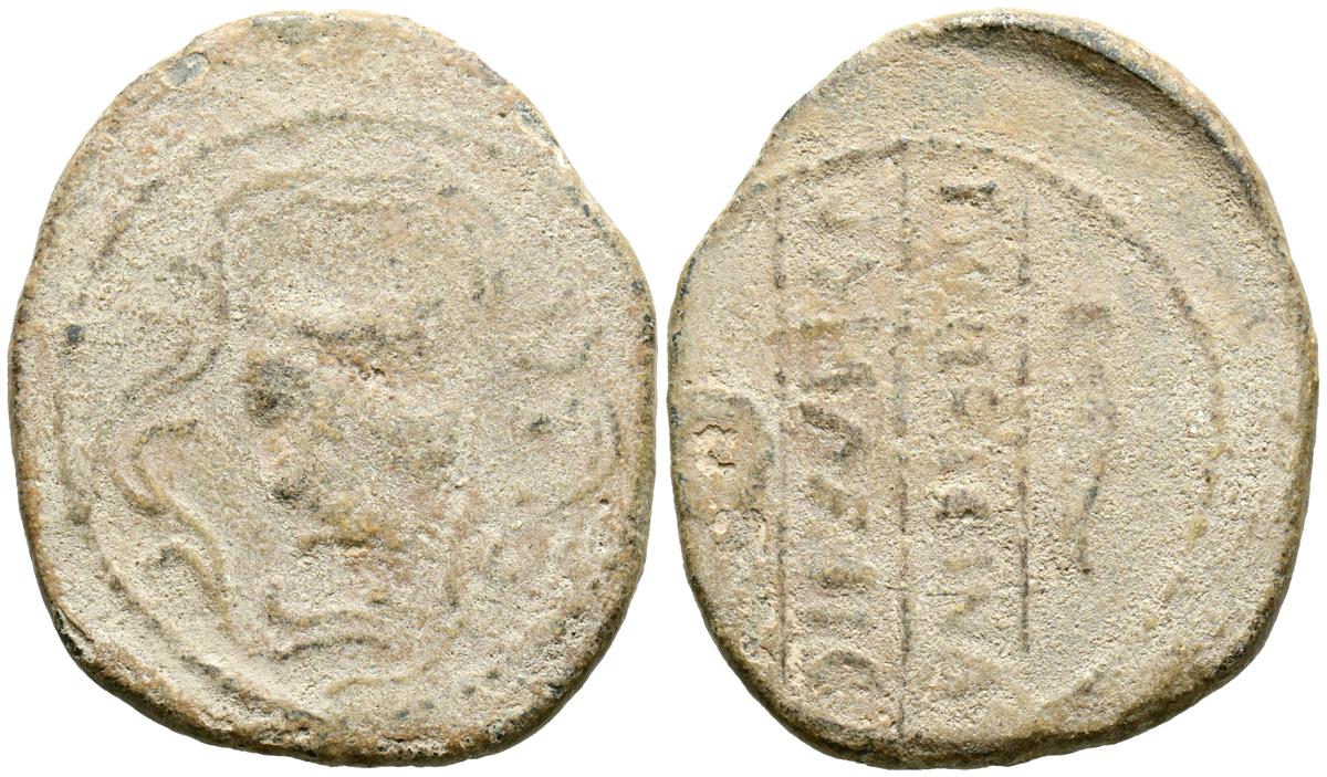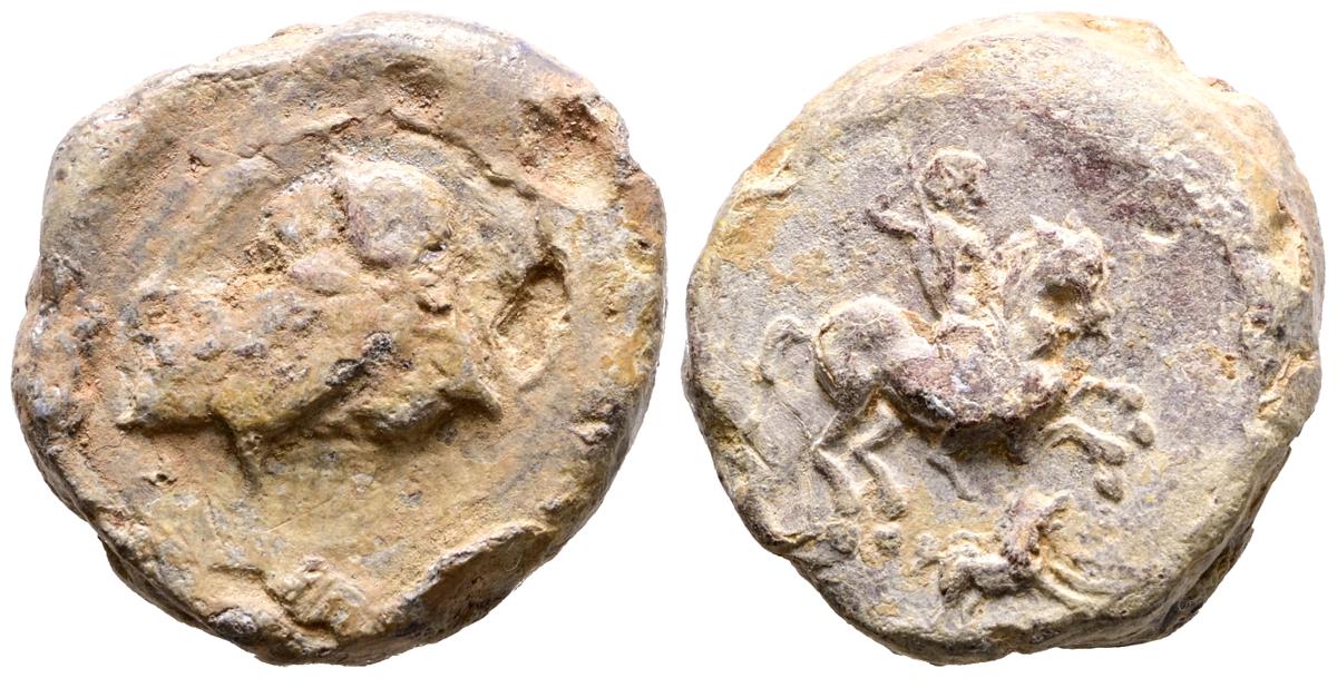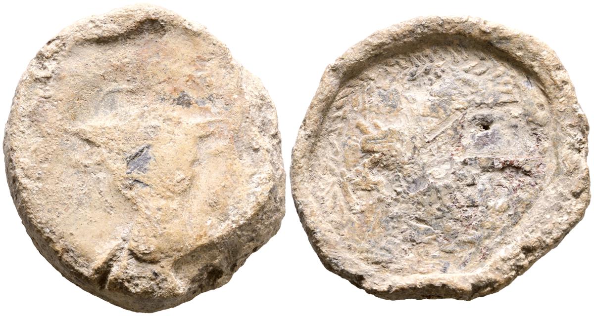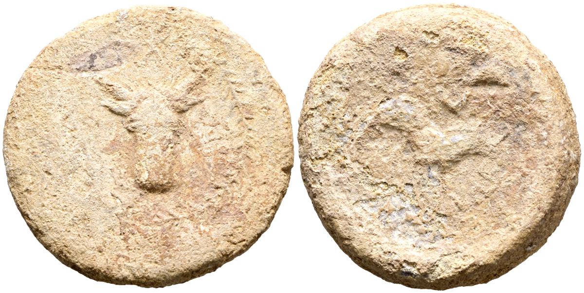 PLOMOS DEIVERSOS DE MEDIANO MODULO. Plomo monetiforme. (Pb. 5,43g/19mm). (CCP pág. 39, nº 2', catalogado como RRR). Anv: Cabeza masculina a derecha, detrás letras ibéricas: SI, delante: RBaISER. Rev: Letra ibérica: S, entre estrella y creciente. MBC-. Muy raro ejemplar. Ex Soler y Llach & Martí Hervera, Subasta 1059 (20/04/2010), Nº Lote 2209.