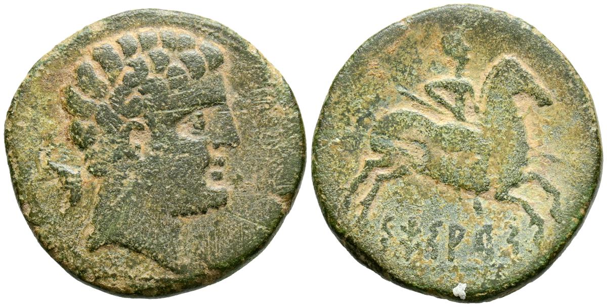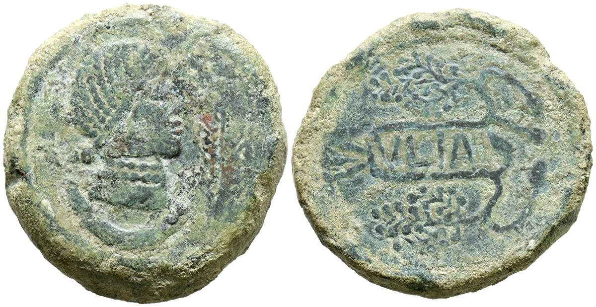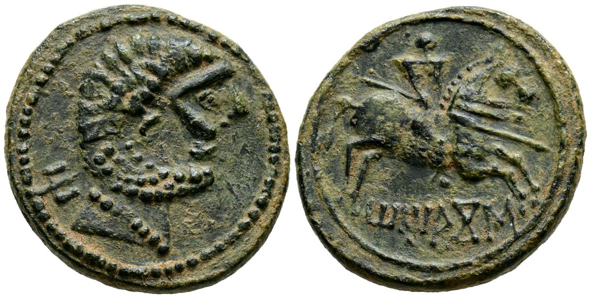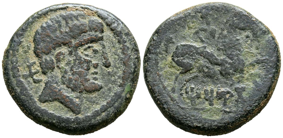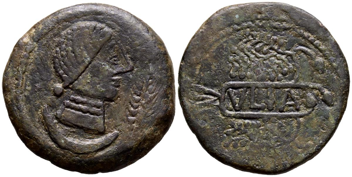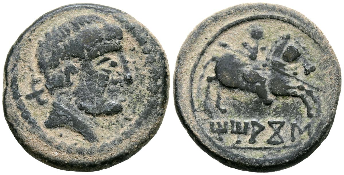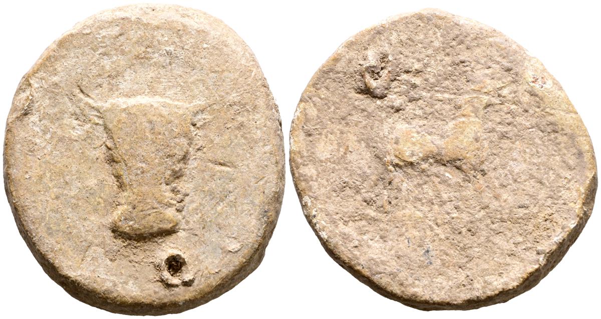 PLOMOS DEIVERSOS DE MEDIANO MODULO. Plomo monetiforme. (Pb. 5,43g/19mm). (CCP pág. 39, nº 2', catalogado como RRR). Anv: Cabeza masculina a derecha, detrás letras ibéricas: SI, delante: RBaISER. Rev: Letra ibérica: S, entre estrella y creciente. MBC-. Muy raro ejemplar. Ex Soler y Llach & Martí Hervera, Subasta 1059 (20/04/2010), Nº Lote 2209.