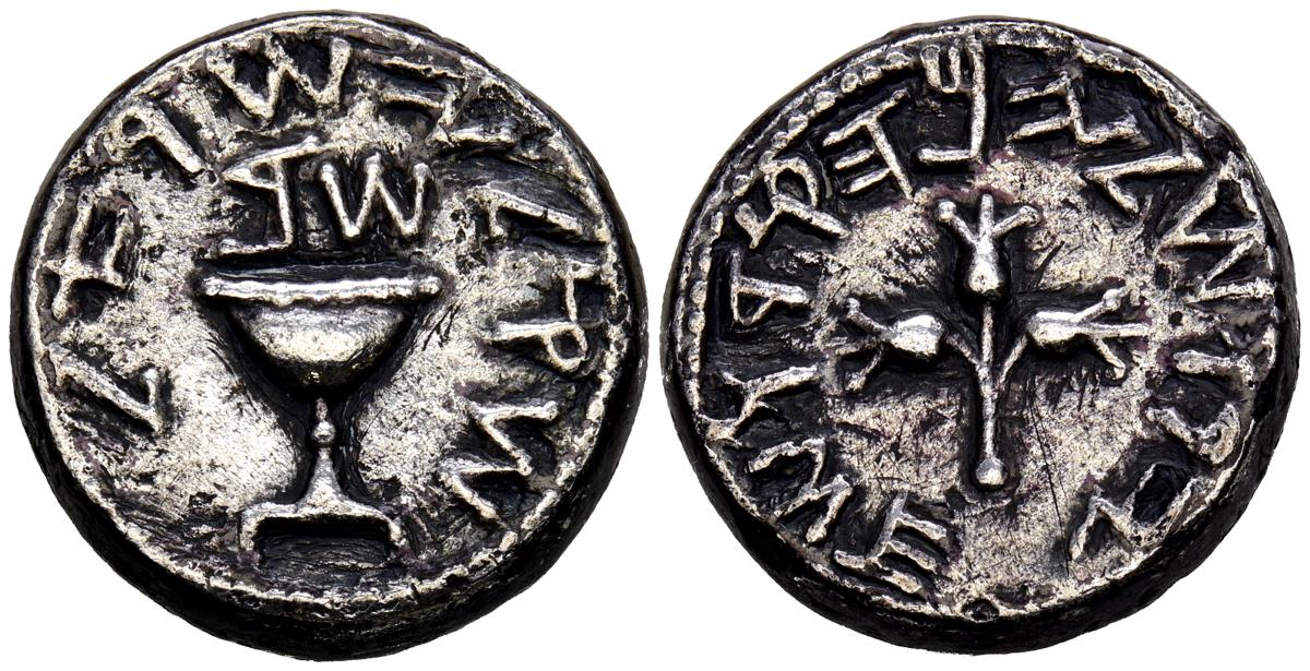 La Primera Guerra Judía o también llamada Gran Revuelta Judía forma parte de una serie de conflictos bélicos que enfrentó al pueblo judío con el Imperio Romano entre los siglos I y VII d.C. Esta pieza, de enorme trascendencia histórica, pertenece al primero de ellos , teniendo entre sus coetáneos a figuras de la talla de Vespasiano o Tito, este último artífice de la conquista de Jerusalén allá por el año 70 d.C . En el año 68 d.C., año de acuñación de esta moneda, sucedió una de las principales campañas romanas que sometió a gran parte de Judea, Samaria, Idumea y Perea, dejando a la emblemática y estratégica Jerusalén aislada y lista para un gran golpe final. Sin embargo, este hecho no sucedió hasta pasados un par de años ya que las disputas en torno al trono imperial alargaron, más de lo deseado, este conflicto provocando una breve reactivación de las tropas judías que terminaron por, finalmente, sucumbir ante el poderío militar de Tito que terminó no sólo con la revuelta en este primera fase, sino que arrasó completamente la ciudad. Lo ocurrido por estas fechas en Judea no es diferente a lo que acontecía en otros lugares del Imperio, donde las desigualdades sociales, los altos impuestos y los malos gobiernos invitaban a continuas rebeliones. Sin embargo, en el caso de Judea habría que añadir también el aspecto religioso-político como diferenciador: no ser judío era motivo suficiente para cuestionar la legitimidad de un gobierno romano sobre Judea.