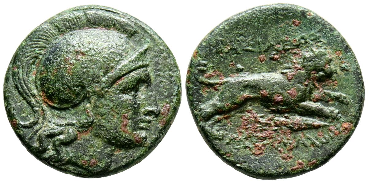 TRACIA, Lysimacos. Ae19. (Ae. 4,69g/20mm). 306-281 a.C. (SNG, Copenhague, 1159). Anv: Cabeza de Atenas con casco a derecha. Rev: León a derecha, detrás monograma, alrededor leyenda griega. MBC.
