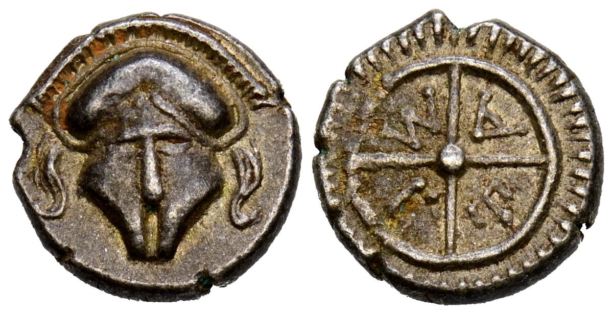TRACIA, Mesembria. Dióbolo. (Ar. 1,31g/11mm). 450-350 a.C. (Seaby 1673). Anv: Casco de frente. Rev: Rueda de cuatro radios, dentro leyenda: META. MBC+.