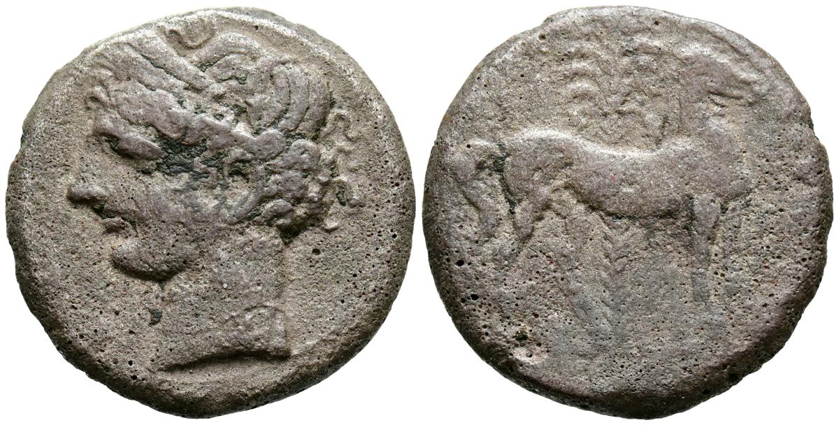 ZEUGITANIA, Cártago. Doble Shekel. (Ar. 11,62g/24mm). 200-146 a.C. Anv: Cabeza diademada de Tanit a izquierda. Rev: Caballo avanzando a derecha. MBC-/BC+. Oxidaciones.