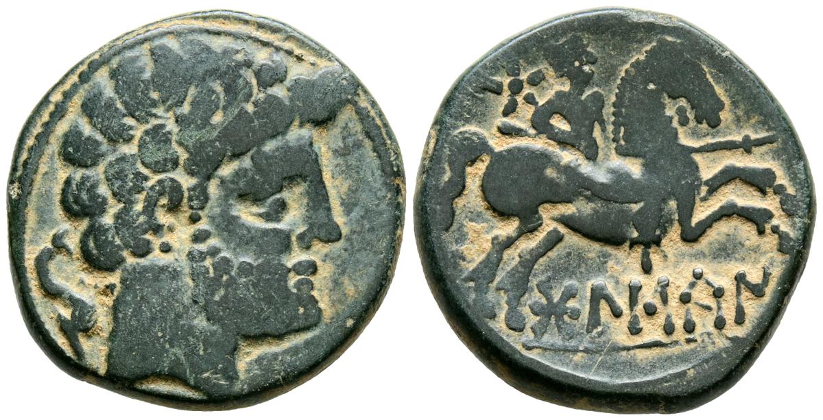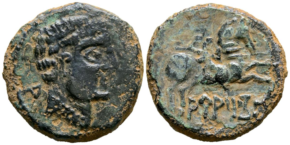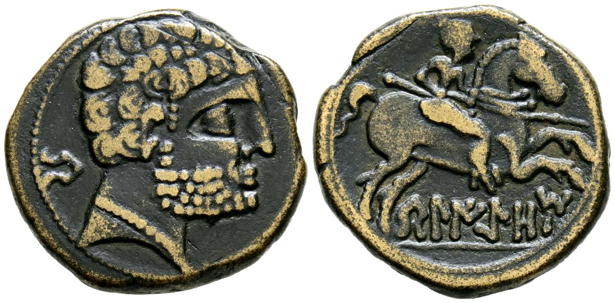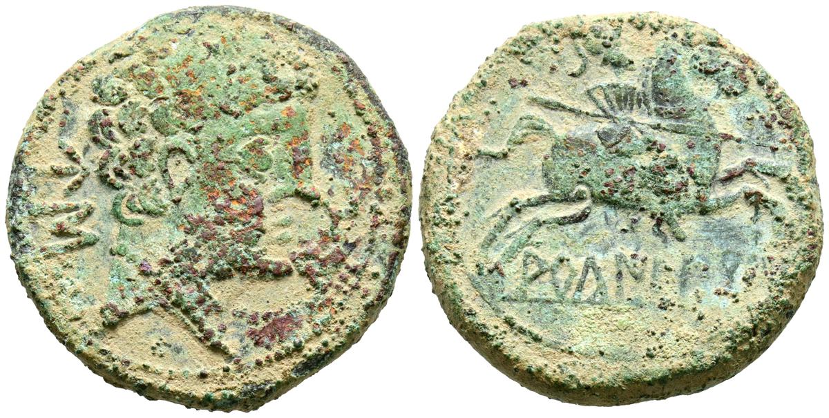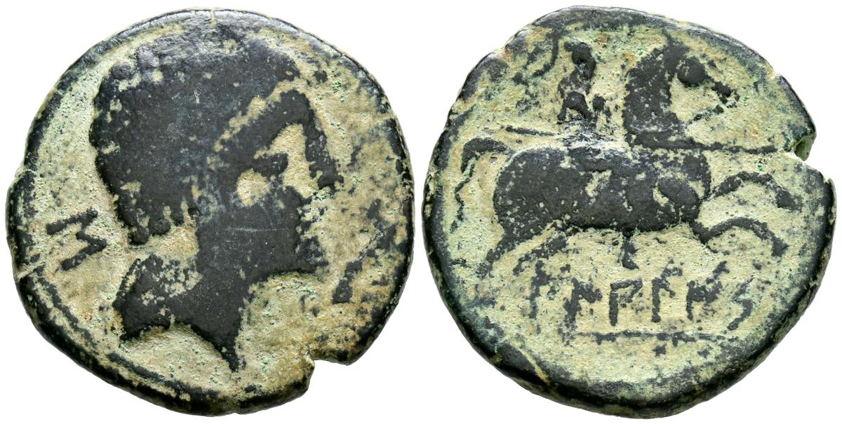 BELIGIOM (Belchite, Zaragoza). As. (Ae. 7,61g/25mm). 120-20 a.C. (FAB-243). Anv: Cabeza masculina barbada a derecha, detrás letra ibérica: Be. Rev: Jinete con lanza a derecha, debajo leyenda ibérica: BeLIGiOM. MBC+. Interesante ejemplar.