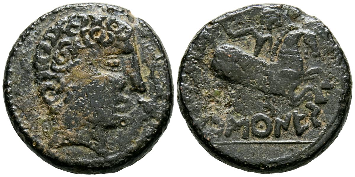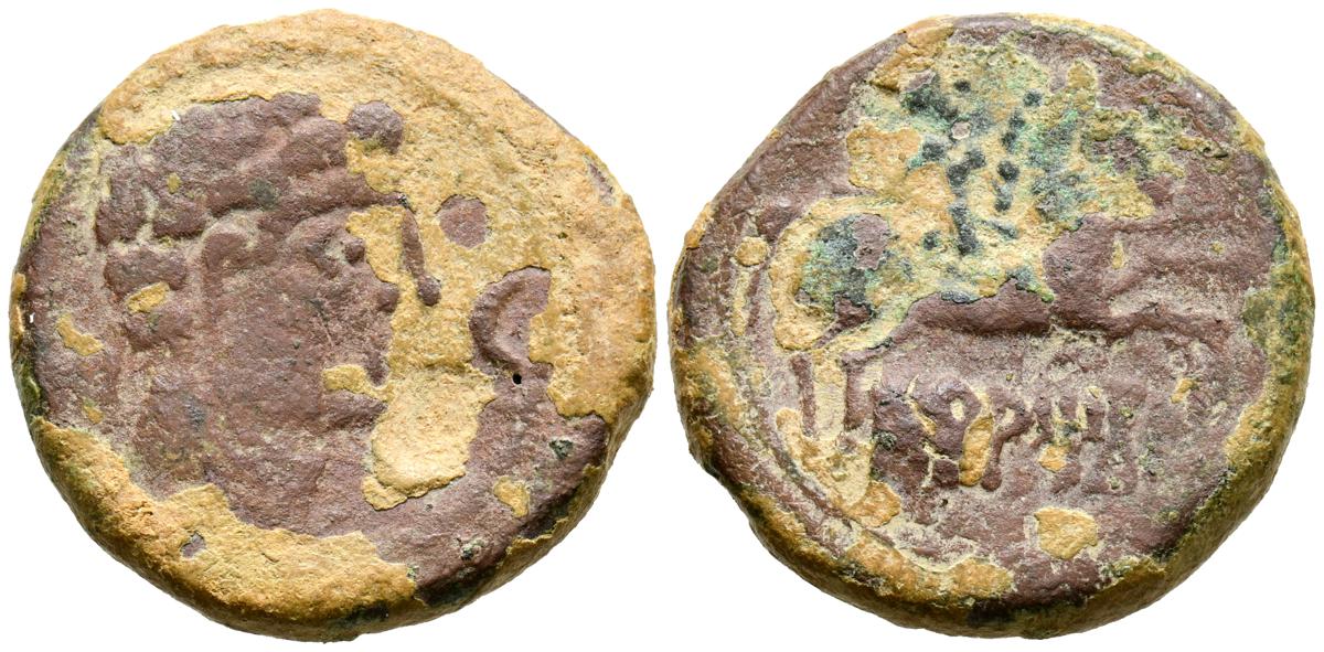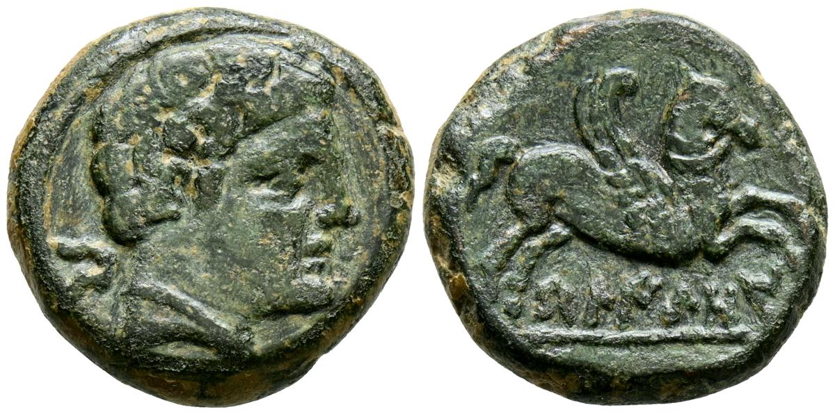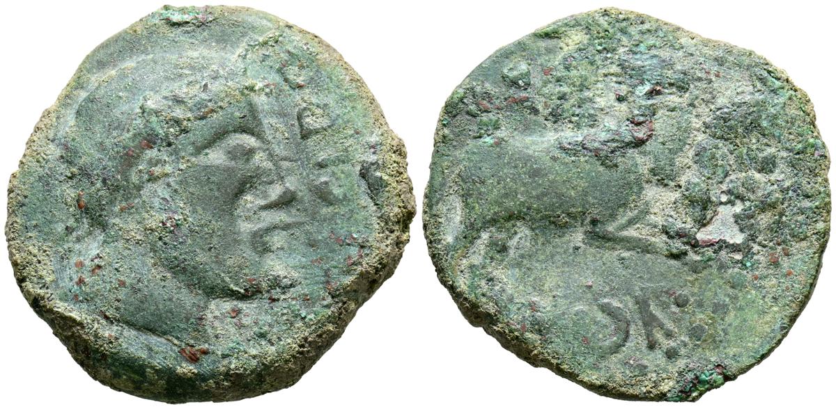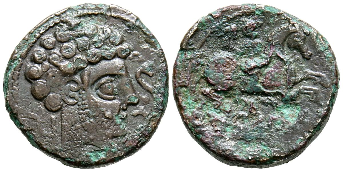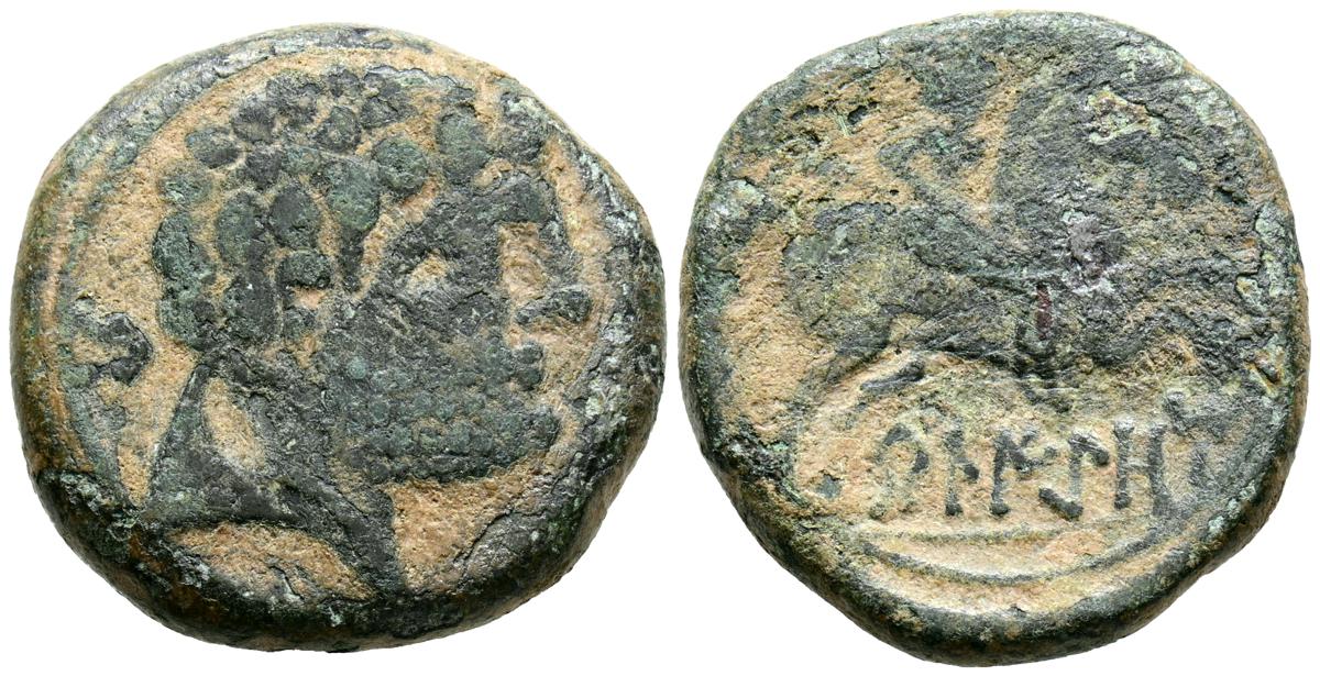 BELIGIOM (Belchite, Zaragoza). Semis. (Ae. 7,59g/20mm). 120-20 a.C. (FAB-245). Anv: Cabeza masculina barbada a derecha, detrás letra ibérica: Be. Rev: Pegaso a derecha, debajo leyenda ibérica sobre línea: BeLIGiOM. MBC+. Atractiva pátina verde. Bonito ejemplar, escaso así.