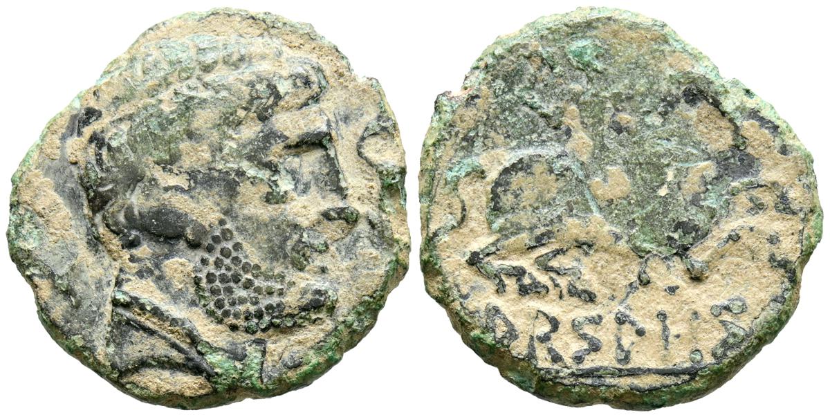 ARSAOS (Zona de Navarra). As. (Ae. 5,13g/23mm). 120-80 a.C. (FAB-144). Anv: Cabeza masculina y barbada a derecha entre dos delfines. Rev: Jinete con dardo a derecha, debajo leyenda sobre línea: ARSAOS. BC.