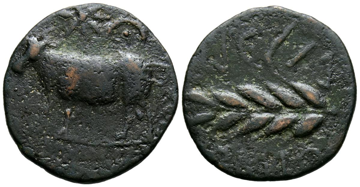ASIDO (Medina Sidonia, Cádiz). Semis. (Ae. 9,39g/23mm). 50 a.C. (FAB-158). Anv: Toro a derecha, encima estrella. Rev: Delfín a derecha, encima creciente y punto, detrás caduceo, debajo leyenda libio-fenicia. MBC+. Puntos de verdín.