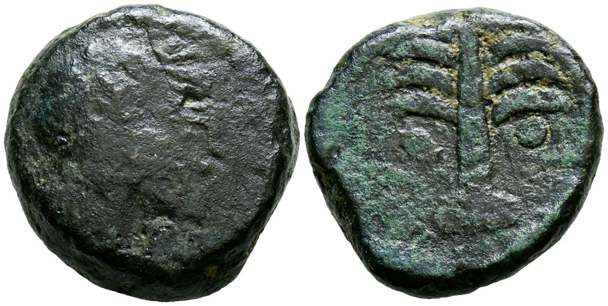 BARIA (Villaricos, Almería). Calco. (Ae. 20,44g/26mm). 200-100 a.C. (FAB-213). Anv: Cabeza de Heracles con piel de león a derecha, de arte bárbaro. Rev: Palmera, de arte bárbaro. BC/MBC-.