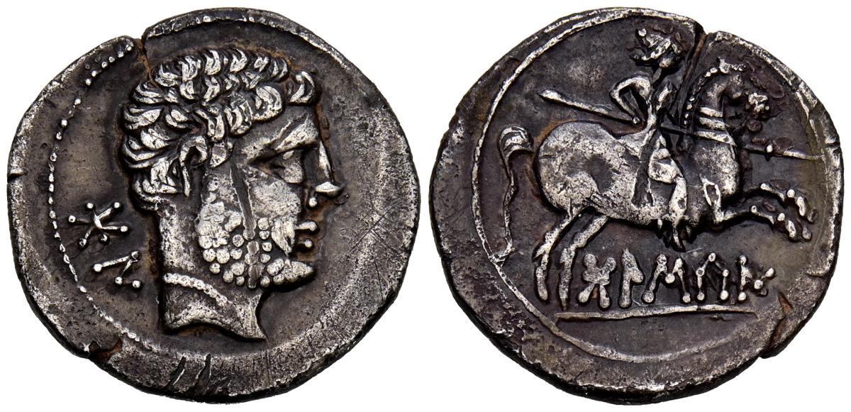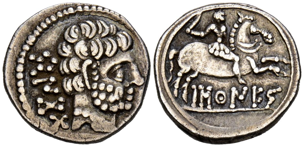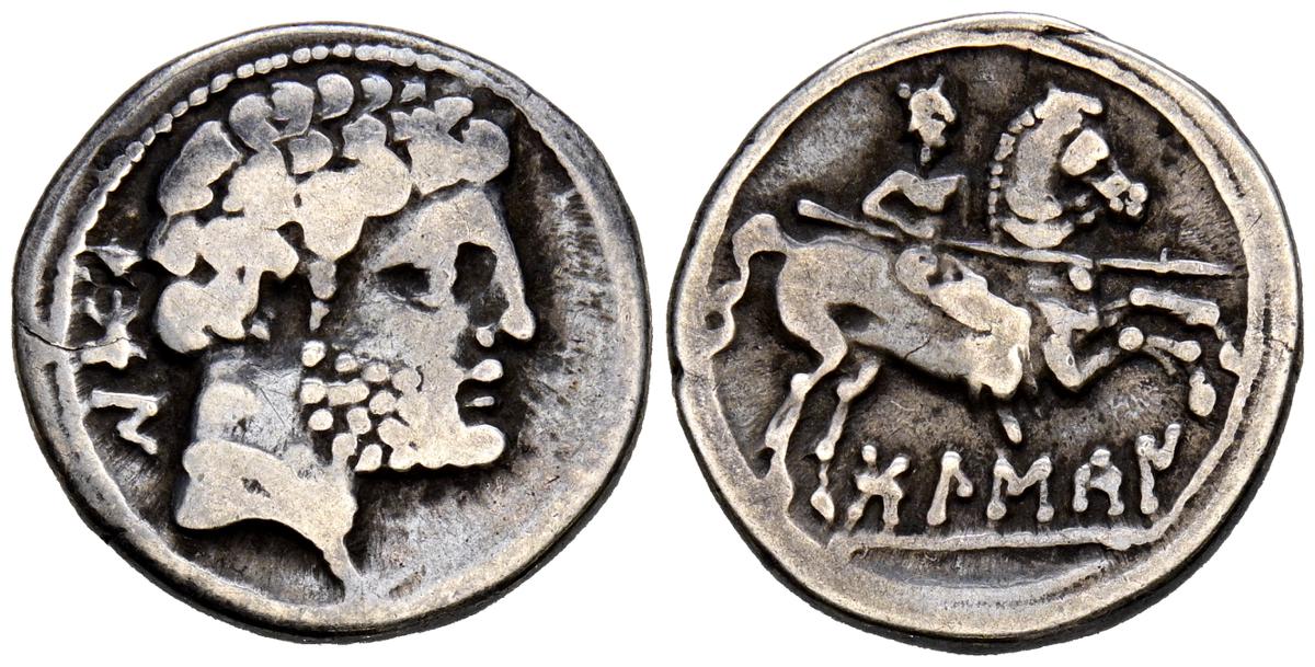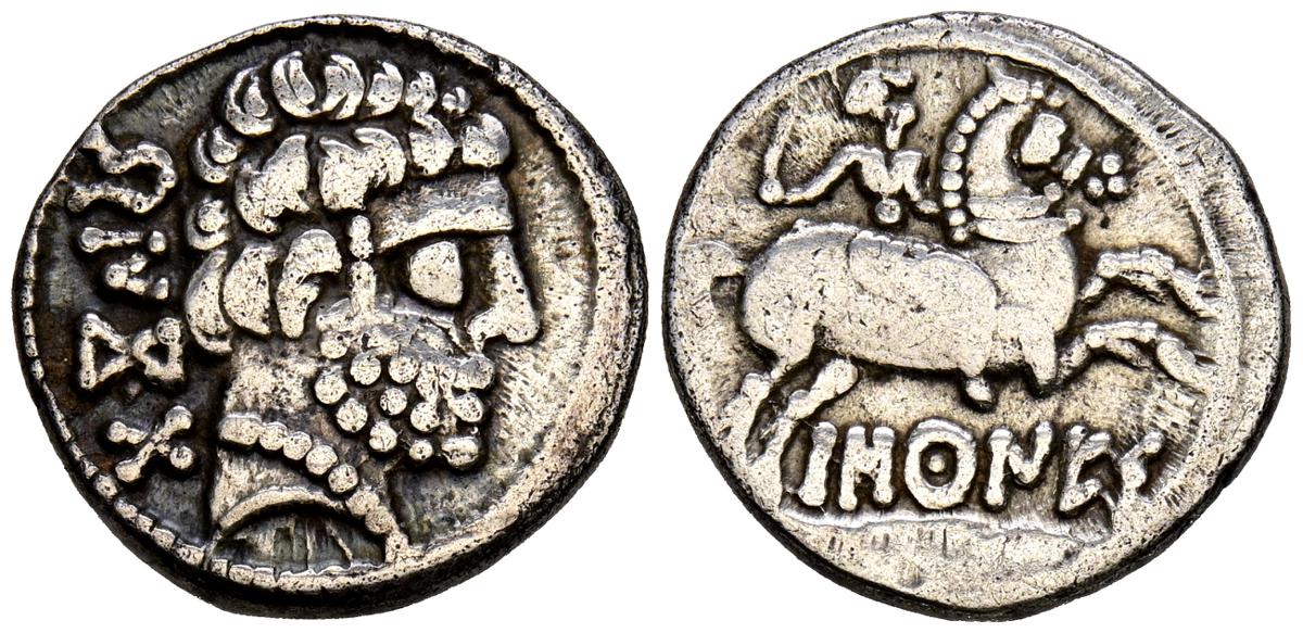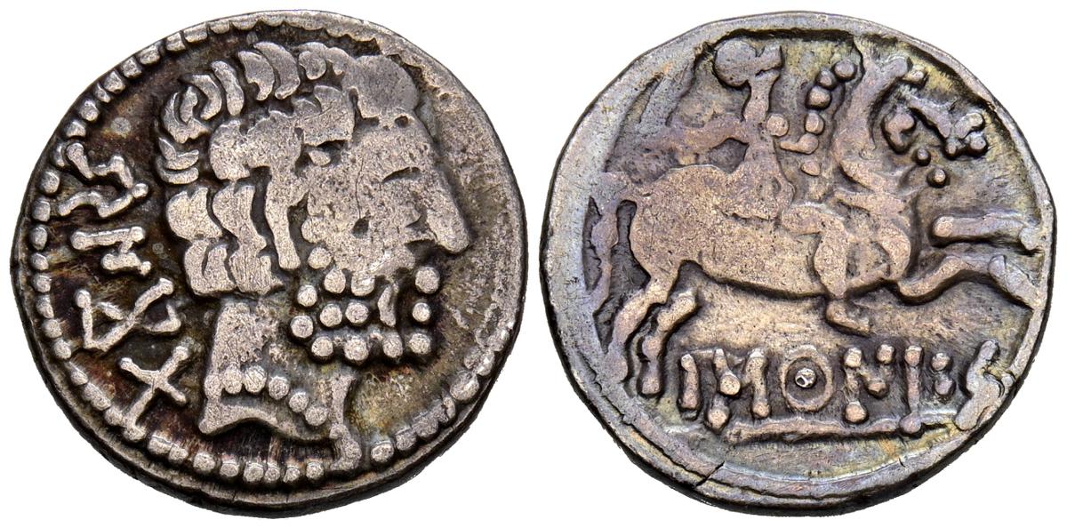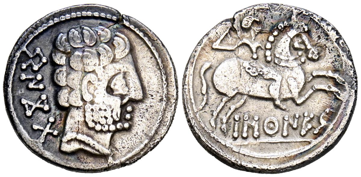 BASCUNES (Pamplona). Denario. (Ar. 3,79g/19mm). 120-20 a.C. (FAB-215). Anv: Cabeza masculina barbada a derecha, detrás leyenda ibérica: BeNCoDa. Rev: Jinete con espada a derecha, debajo leyenda ibérica: BaSCuNES. MBC+. Atractivo ejemplar.