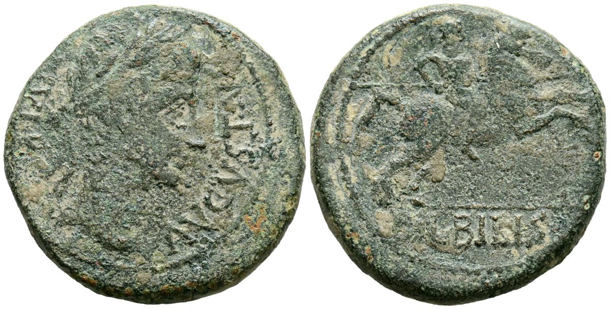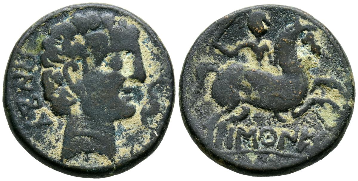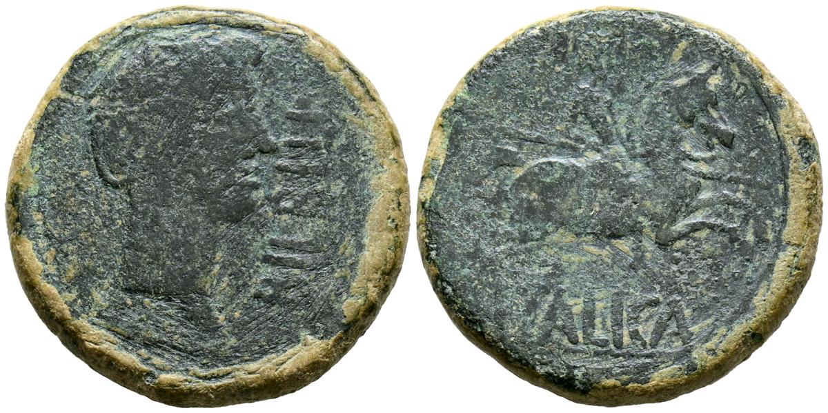 BILBILIS (Calatayud, Zaragoza). As. (Ae. 14,17g/28mm). 30-20 a.C. (FAB-269). Anv: Cabeza de Augusto a derecha, delante leyenda: BILBILIS. Rev: Jinete con lanza a derecha, debajo leyenda: ITALICA, sobre línea. BC+. Limpieza muy agresiva.