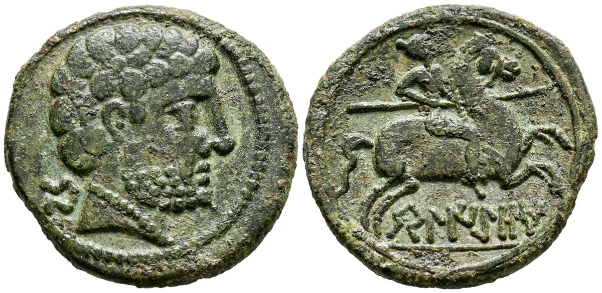 BASCUNES (Pamplona, Navarra). As. (Ae. 8,52g/23mm). 120-20 a.C. (FAB-220).Anv: Cabeza barbada a derecha, detrás leyenda ibérica: BeNCoDa, delante delfín. Rev: Jinete con espada a derecha, debajo leyenda ibérica: BaSCUNES. MBC-. Limpiada.