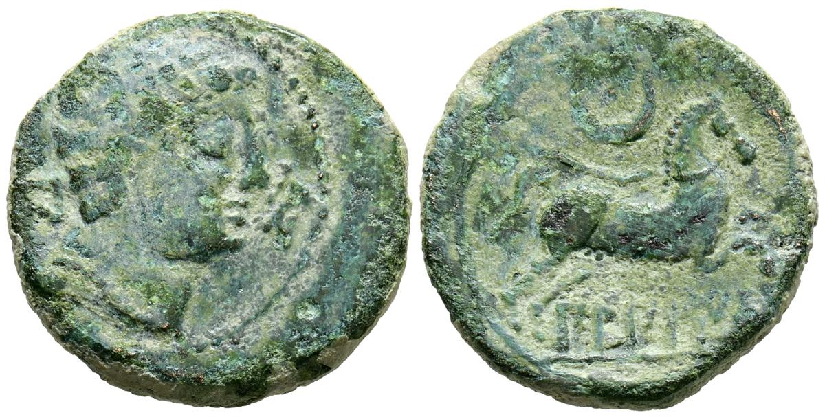 ASIDO (Medina Sidonia, Cádiz). As. (Ae. 4,68g/19mm). 50 a.C. (FAB-164). Anv: Cabeza masculina a izquierda. Rev: Toro a izquierda, encima creciente. RC.
