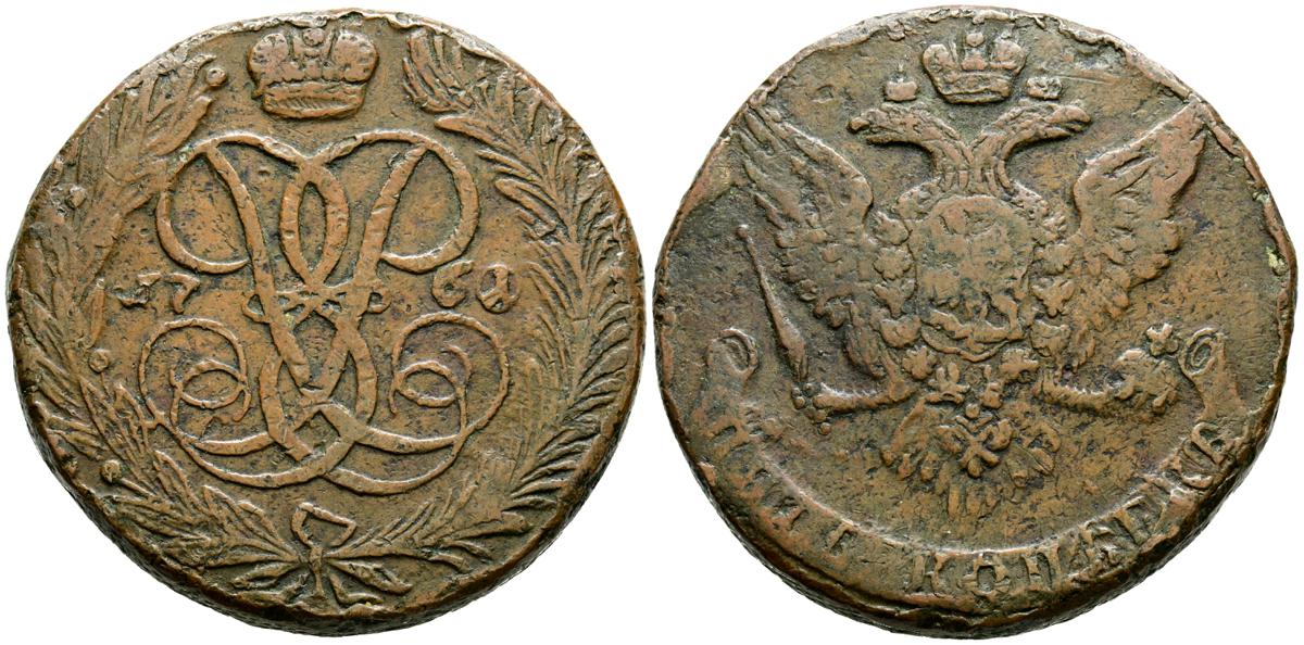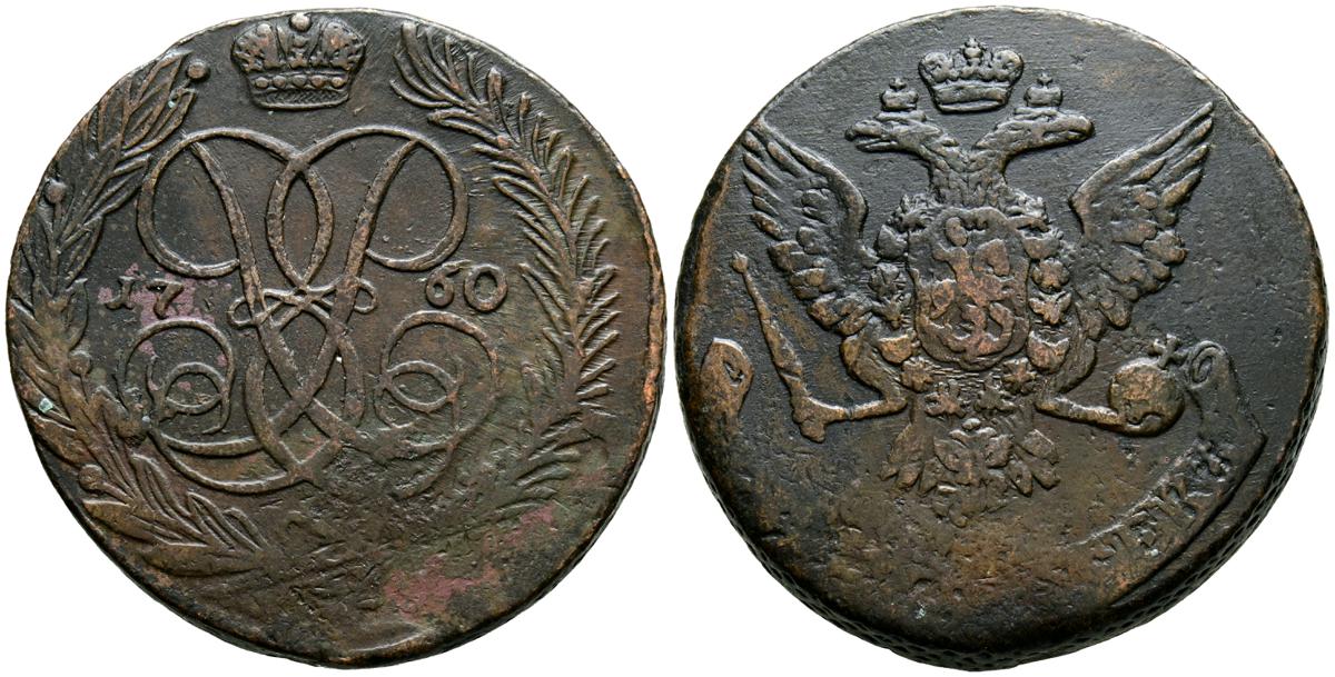 RUSIA, Isabel I (1741-1762). 5 Kopeks. (Ae. 48,87g/41mm). 1760. Ekaterinburgo. (Km#C9.2). MBC.