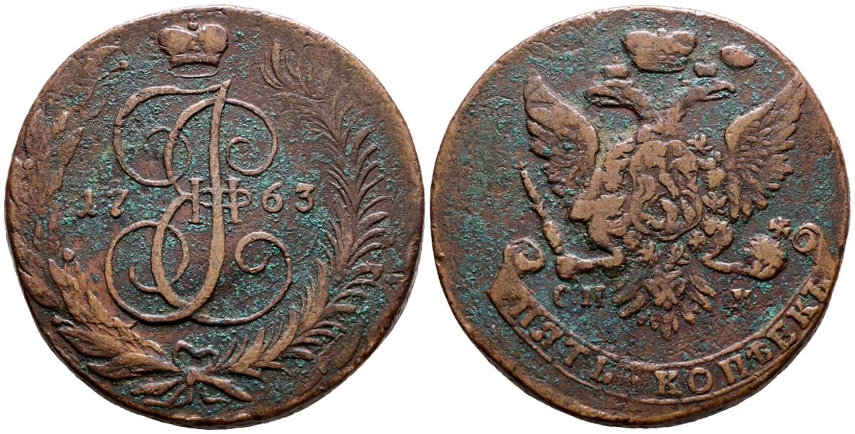 RUSIA, Catalina II (1762-1796). 5 Kopeks. (Ae. 59,11g/45mm). 1763. San Petersburgo SPM. (Km#C59). MBC-.