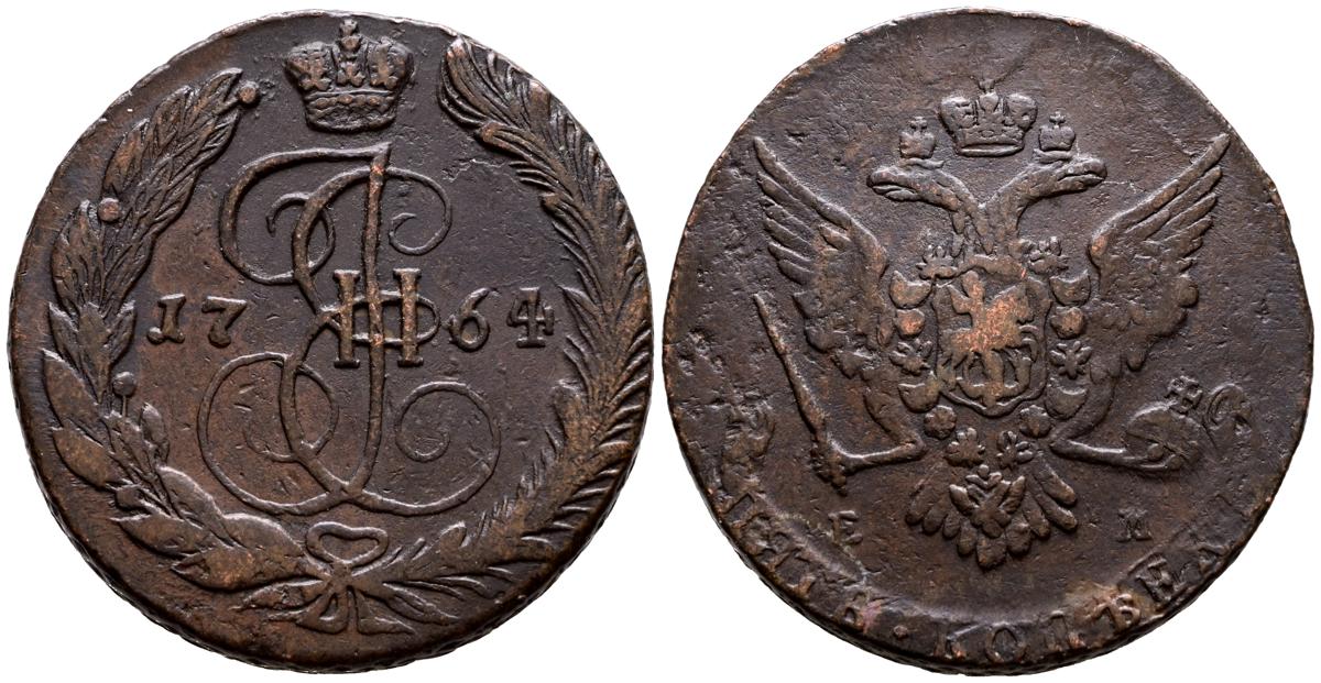 RUSIA, Catalina II (1762-1796). 5 Kopeks. (Ae. 53,57g/41mm). 1764. Ekaterinburgo EM. (Km#C59). MBC+/MBC.