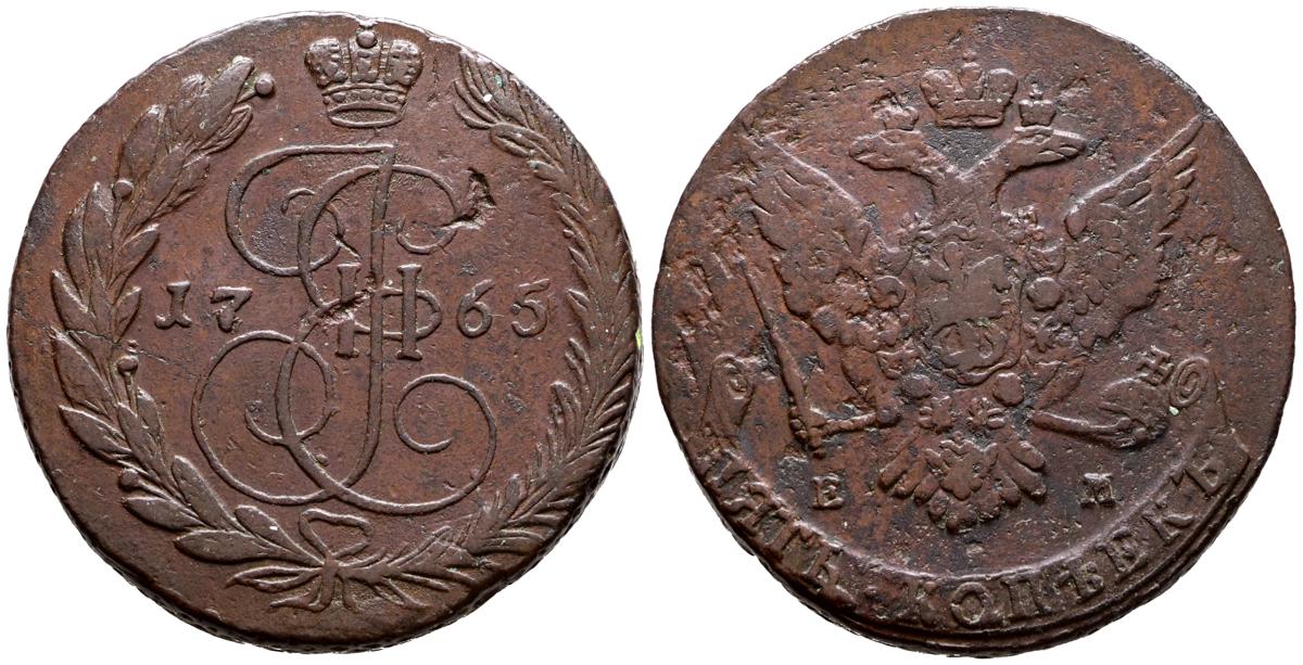 RUSIA, Catalina II (1762-1796). 5 Kopeks. (Ae. 50,37g/42mm). 1765. Ekaterinburgo EM. (Km#C59). MBC.