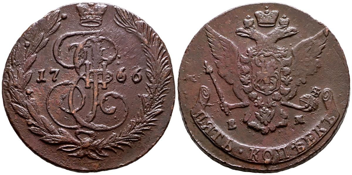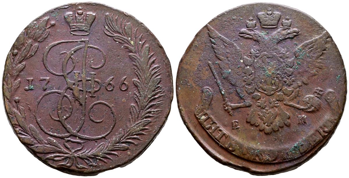 RUSIA, Catalina II (1762-1796). 5 Kopeks. (Ae. 47,68g/42mm). 1766. Ekaterinburgo EM. (Km#C59). MBC.