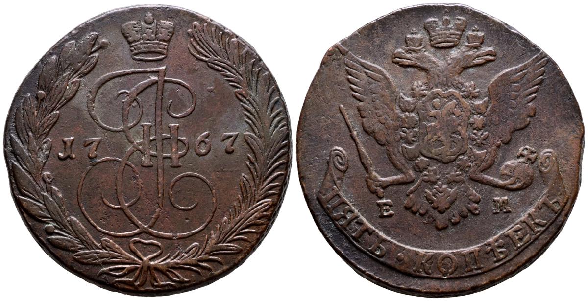 RUSIA, Catalina II (1762-1796). 5 Kopeks. (Ae. 43,82g/42mm). 1767. Ekaterinburgo EM. (Km#C59). MBC/MBC-.