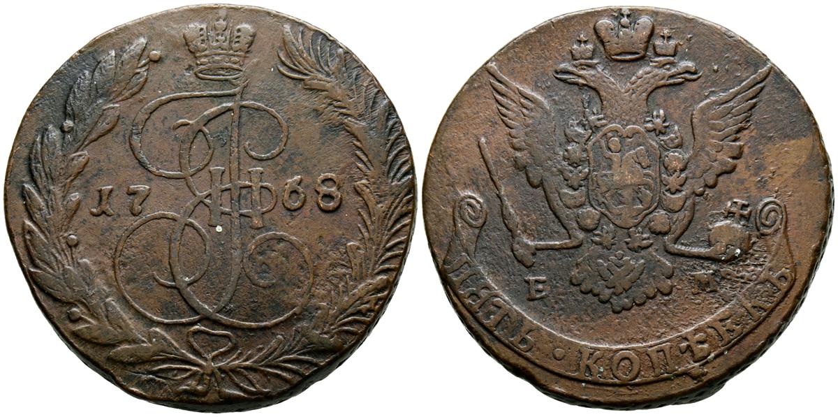 RUSIA, Catalina II (1762-1796). 5 Kopeks. (Ae. 45,93g/42mm). 1768. Ekaterinburgo EM. (Km#C59). MBC.