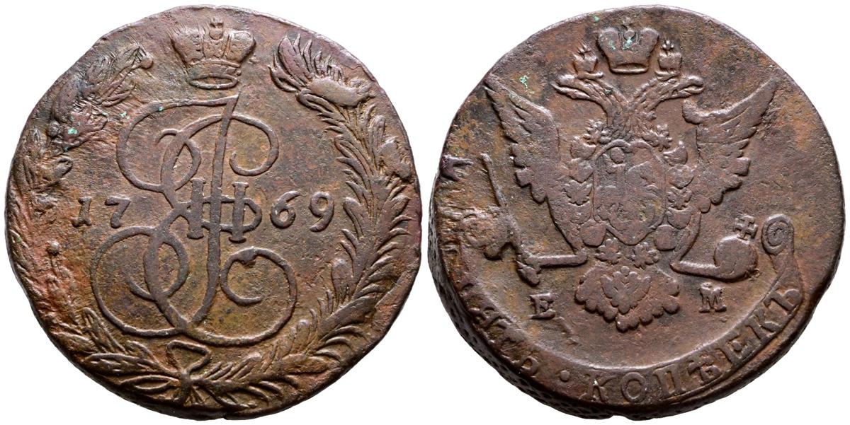 RUSIA, Catalina II (1762-1796). 5 Kopeks. (Ae. 57,60g/43mm). 1769. Ekaterinburgo EM. (Km#C59). MBC+/EBC-.