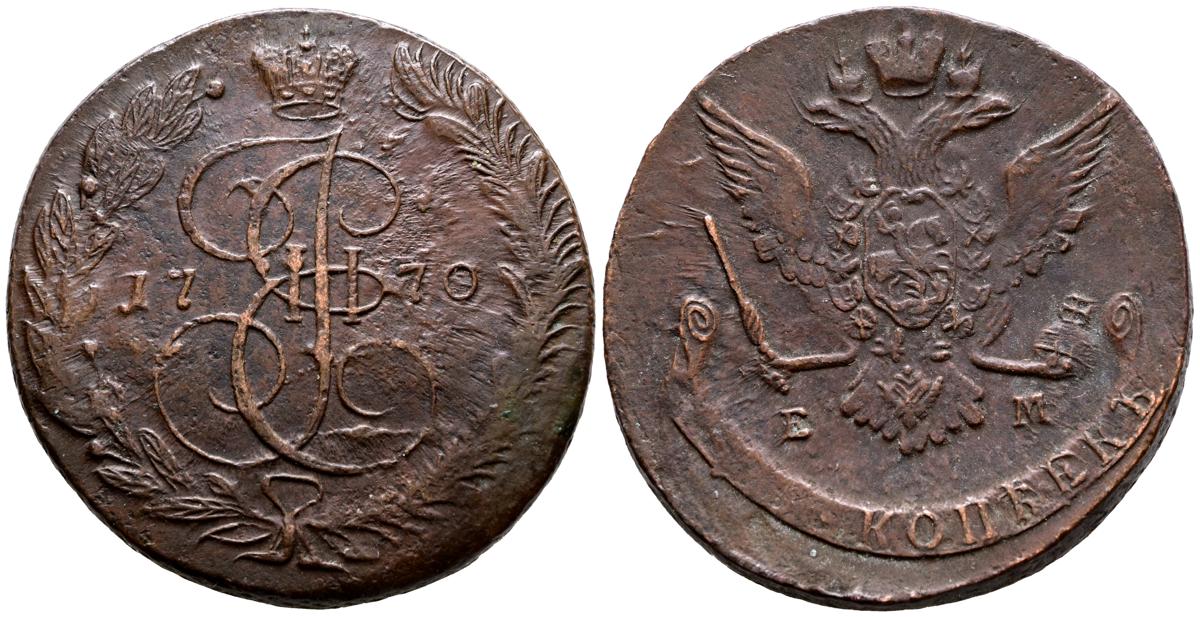 RUSIA, Catalina II (1762-1796). 5 Kopeks. (Ae. 54,04g/43mm). 1770. Ekaterinburgo EM. (Km#C59). MBC.