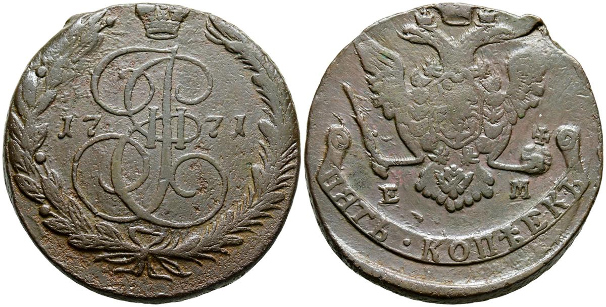 RUSIA, Catalina II (1762-1796). 5 Kopeks. (Ae. 48,36g/42mm). 1771. Ekaterinburgo EM. (Km#C59). MBC+.