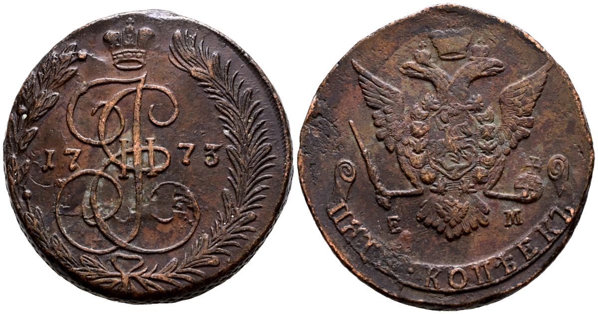 RUSIA, Catalina II (1762-1796). 5 Kopeks. (Ae. 56,88g/43mm). 1773. Ekaterinburgo EM. (Km#C59). MBC.