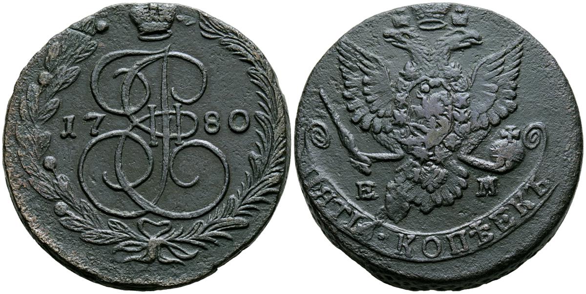 RUSIA, Catalina II (1762-1796). 5 Kopeks. (Ae. 43,11g/43mm). 1780. Ekaterinburgo EM. (Km#C59). MBC+.