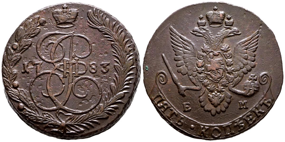 RUSIA, Catalina II (1762-1796). 5 Kopeks. (Ae. 58,78g/42mm). 1783. Ekaterinburgo EM. (Km#C59). MBC+. Marquitas en anverso.