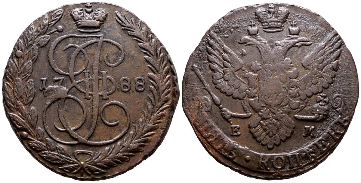RUSIA, Catalina II (1762-1796). 5 Kopeks. (Ae. 54,65g/43mm). 1788. Ekaterinburgo EM. (Km#C59). EBC. Magnífico ejemplar.