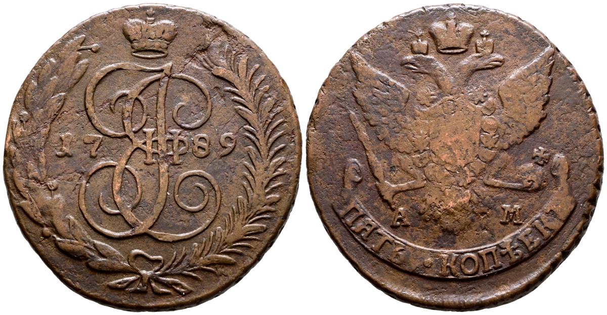 RUSIA, Catalina II (1762-1796). 5 Kopeks. (Ae. 45,10g/44mm). 1789. Anninsky AM. (Km#C59). MBC/MBC-. Escasa.