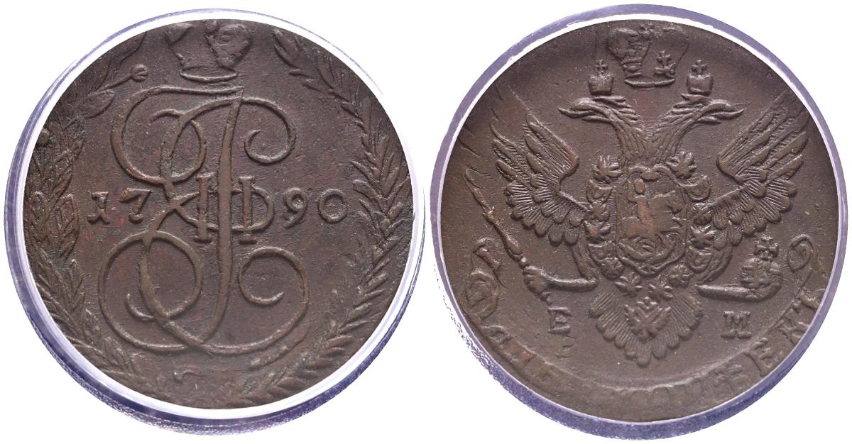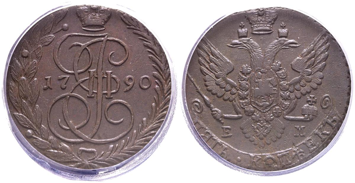 RUSIA, Catalina II (1762-1796). 5 Kopeks. (Ae. 51,19g/42mm)*. 1790. Ekaterinburgo EM. (Km#C59). Encapsulada por PCGS AU 58. *Peso y medidas teóricos.