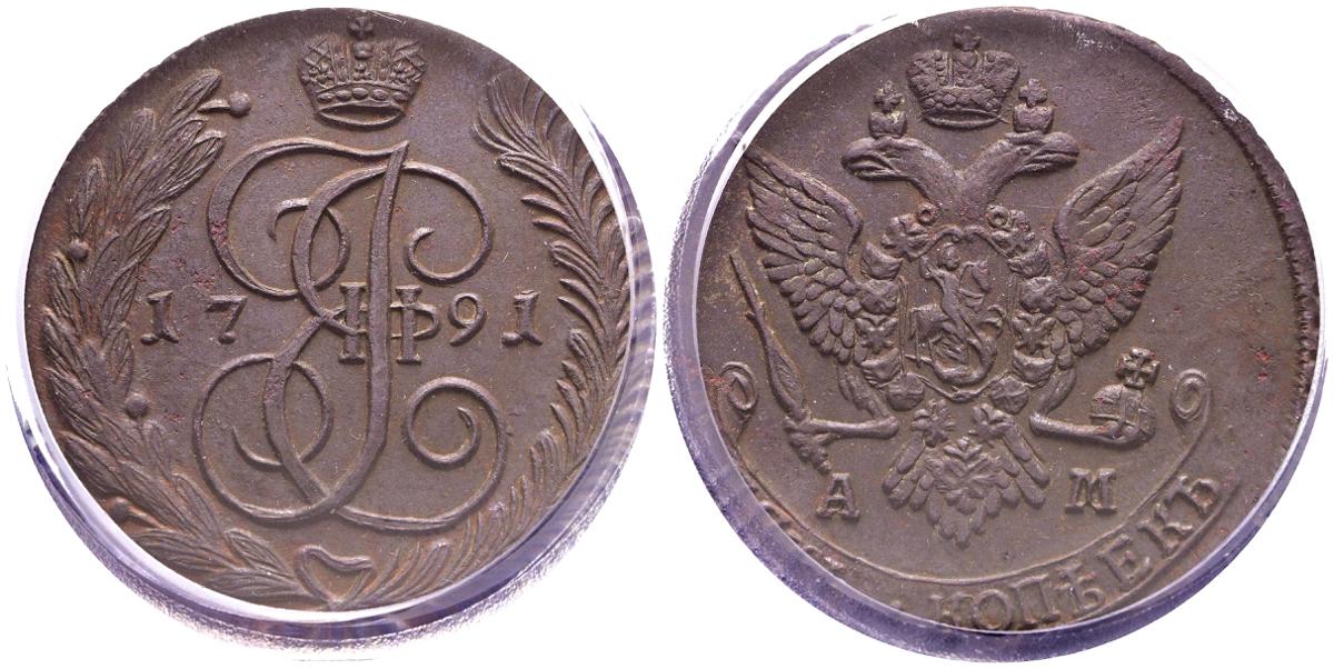 RUSIA, Catalina II (1762-1796). 5 Kopeks. (Ae. 51,19g/42mm)*. 1791. Anninsky AM. (Km#C59). Encapsulada por PCGS AU 58. Escasa. *Peso y medidas teóricos.