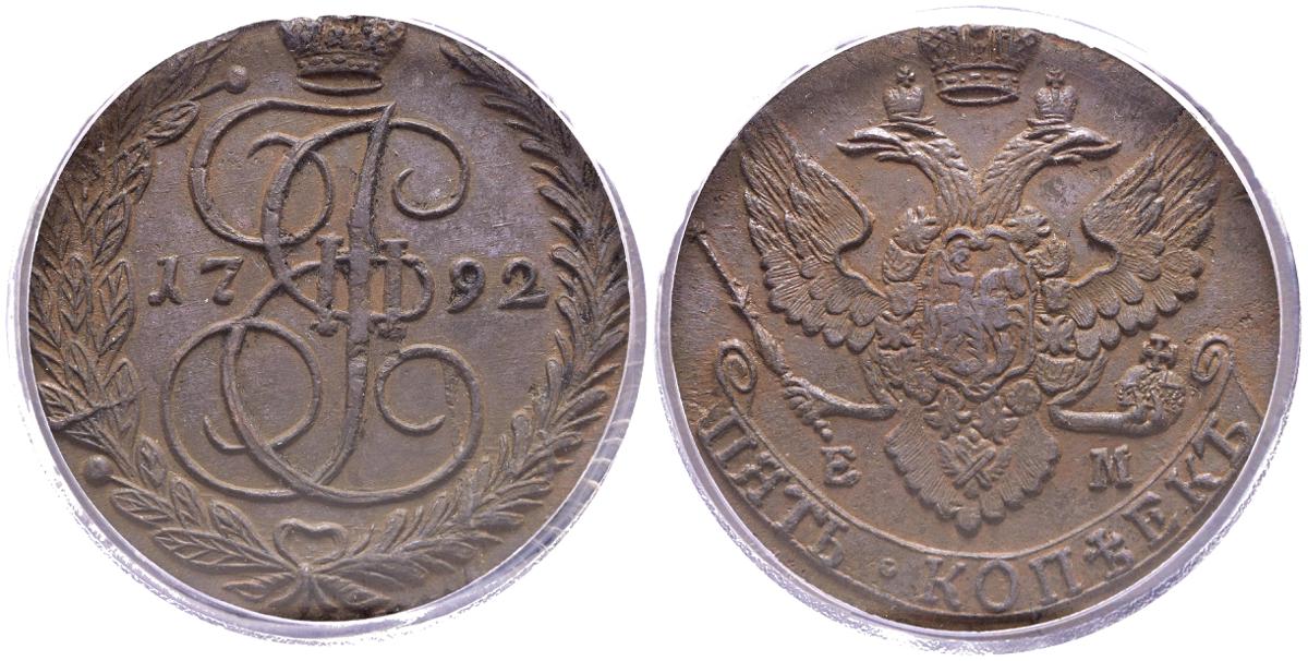 RUSIA, Catalina II (1762-1796). 5 Kopeks. (Ae. 51,19g/42mm)*. 1792. Ekaterinburgo EM. (Km#C59). Encapsulada por PCGS MS 62 BN. *Peso y medidas teóricos.