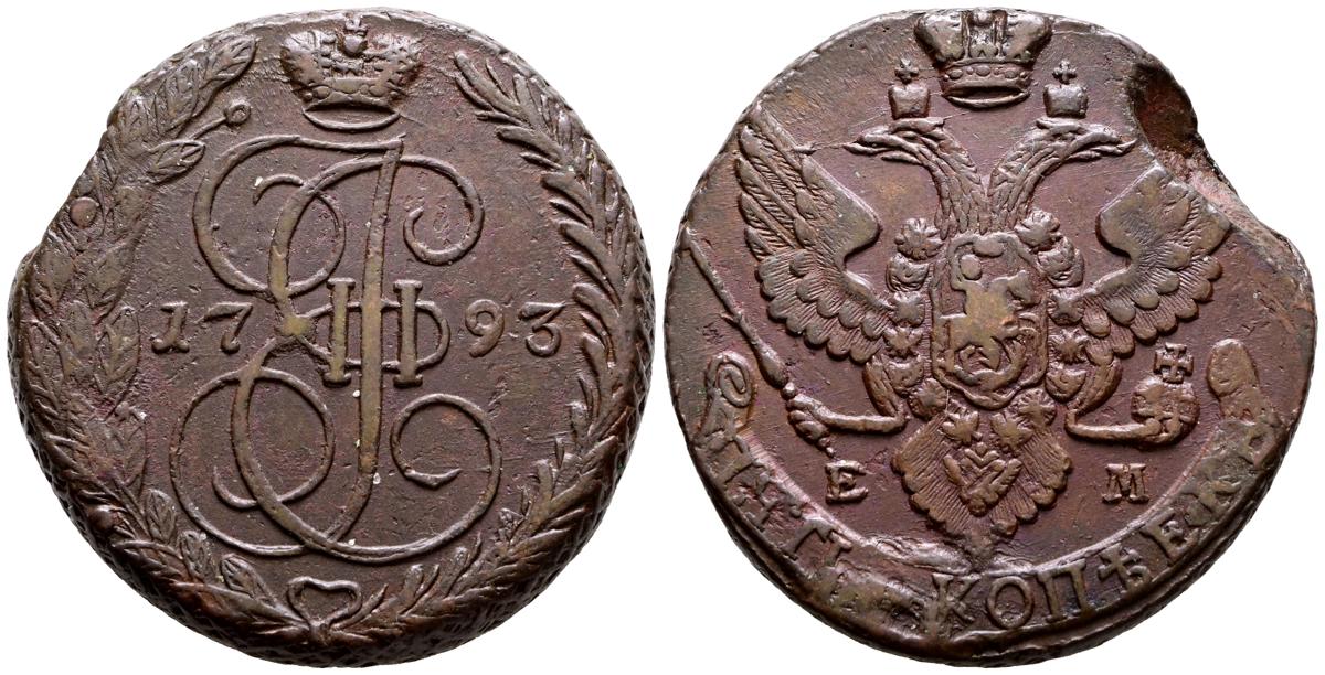 RUSIA, Catalina II (1762-1796). 5 Kopeks. (Ae. 55,98g/42mm). 1793. Ekaterinburgo EM. (Km#C59). MBC+. Cospel faltado.
