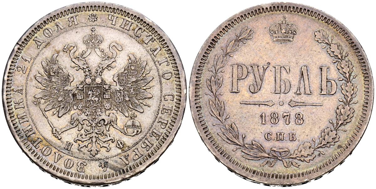 RUSIA, Alejandro II. 1 Rublo. (Ar. 20,70g/36mm). 1878. San Petesburgo. (Km#25). MBC. Preciosa pátina.