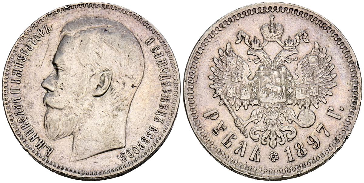 RUSIA, Nicolás II. 1 Rublo. (Ar. 19,90g/34mm). 1897. Bruselas, dos estrellas en el canto. (Km#59). MBC.