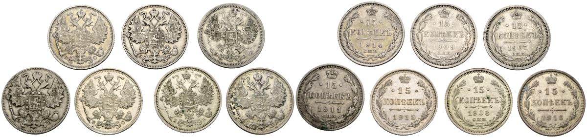RUSIA. Bonito conjunto de 7 monedas de 15 kopeks acuñados entre 1907 y 1916. Sin piezas repetidas. Diferentes estados de conservación. A EXAMINAR.