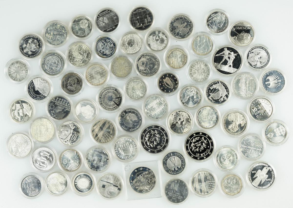 MONEDAS EXTRANJERAS. Conjunto de 64 monedas en plata conmemorativa con diversos valores de Euros (5 y 10 principalmente). Variedad de países y fechas con un alto nivel de conservación general. Incluye cápsulas. A EXAMINAR.