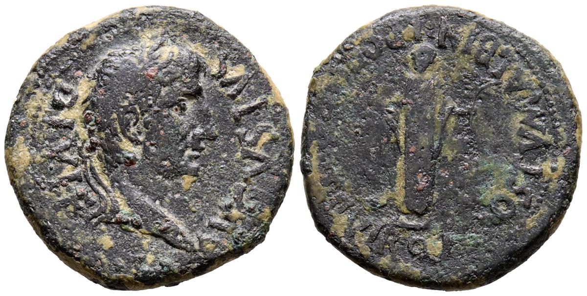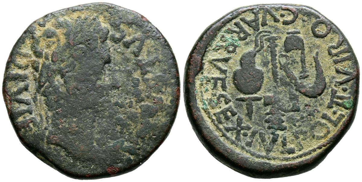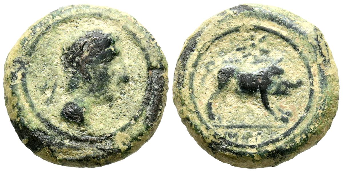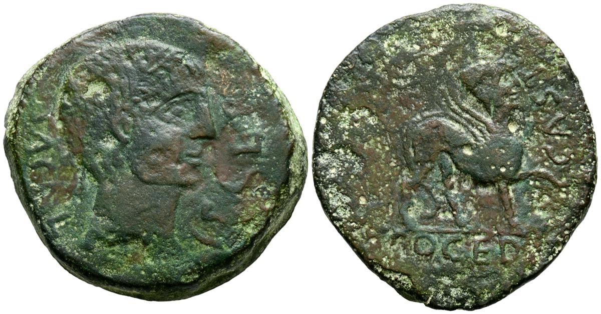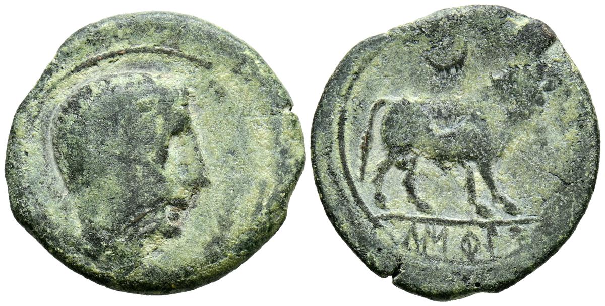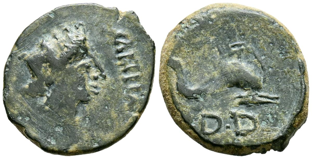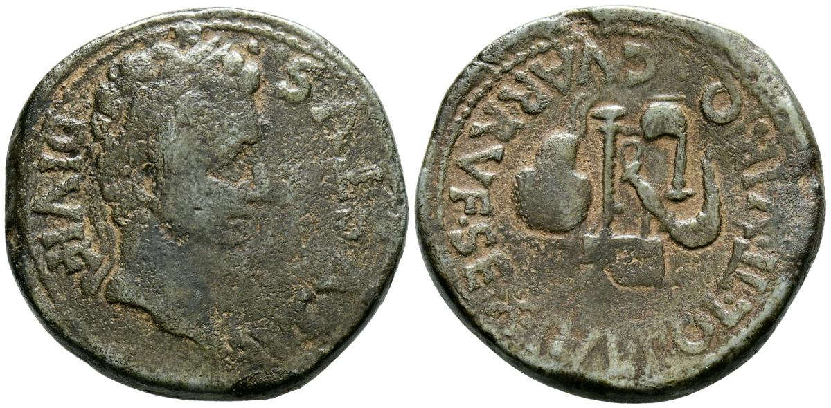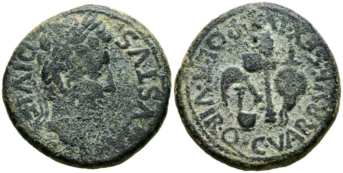CARTAGONOVA (Cartagena, Murcia). As. (Ae. 10,10g/29mm). 27 a.C.-14 d.C. (FAB-577). Anv: Cabeza de Augusto laureado a derecha, alrededor leyenda: AVGVSTVS DIVI F. Rev: Aspérgilo, símpulo, segur y apex, alrededor leyenda: C VAR RVF SEX IVL POL II VOR Q. MBC-/MBC.