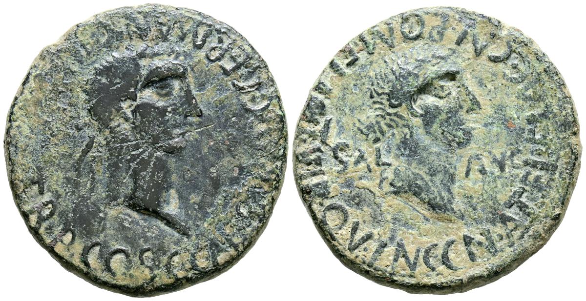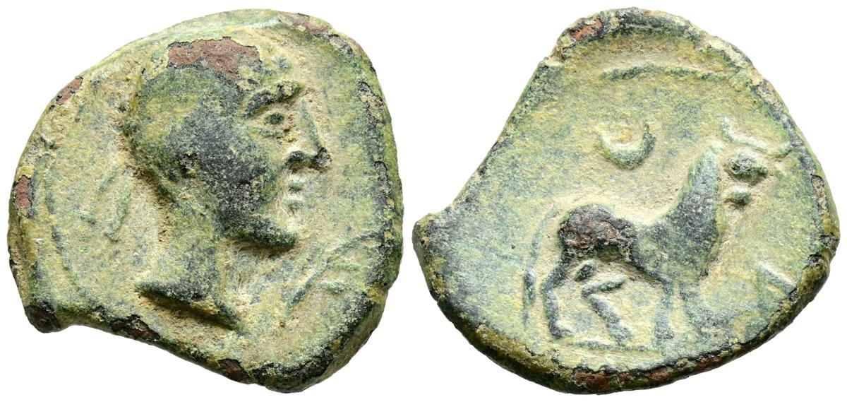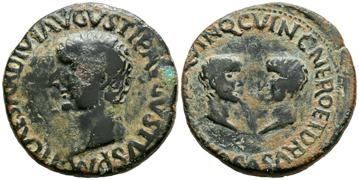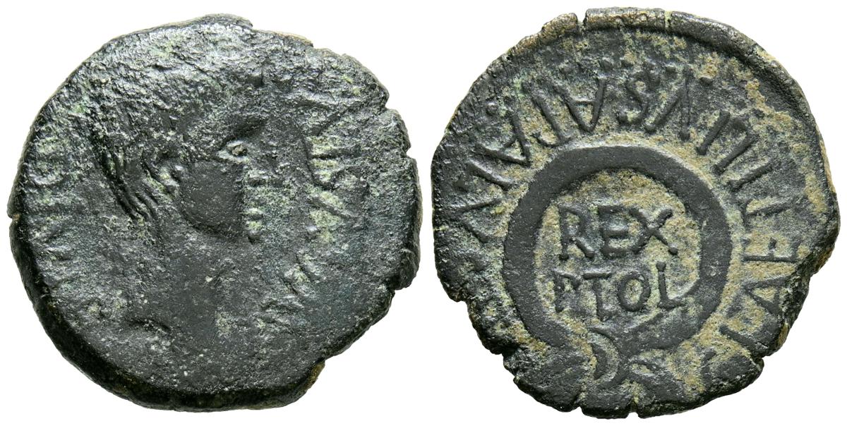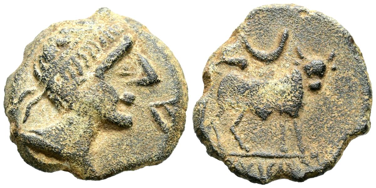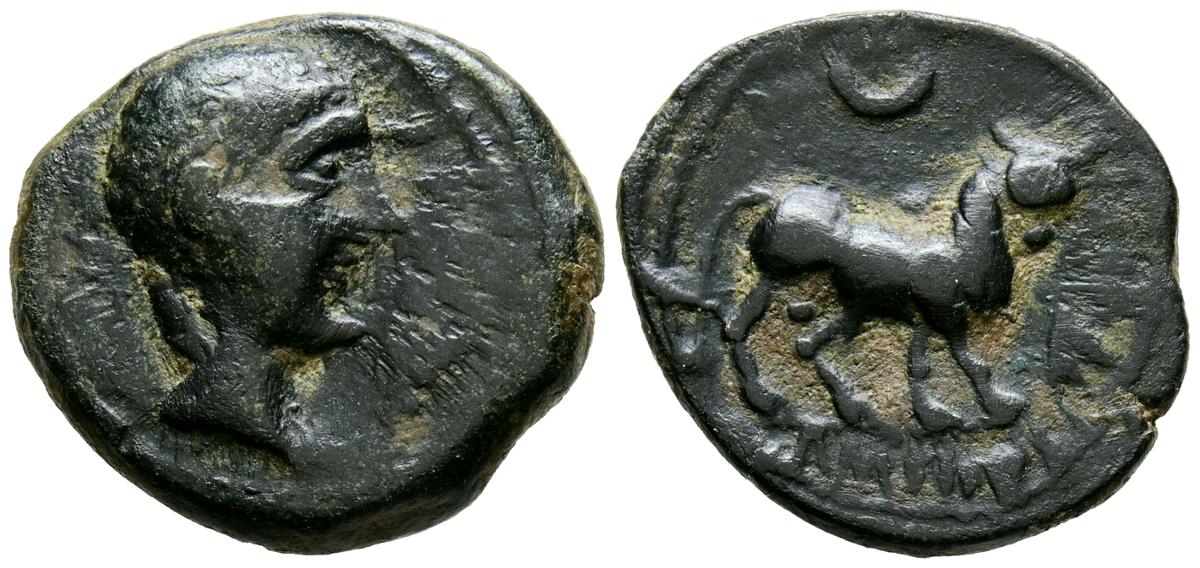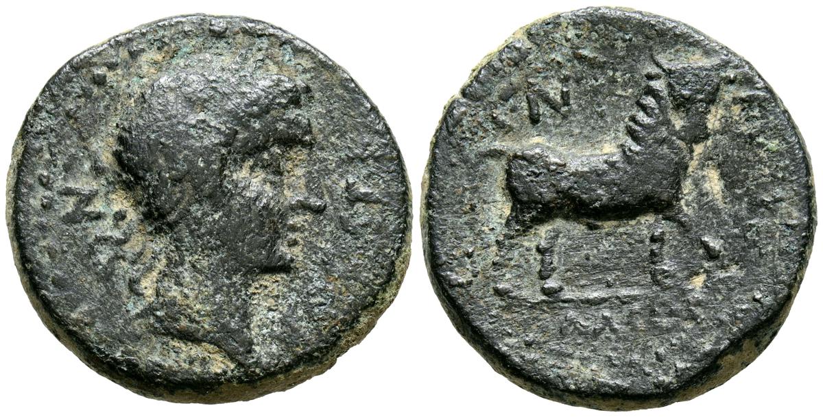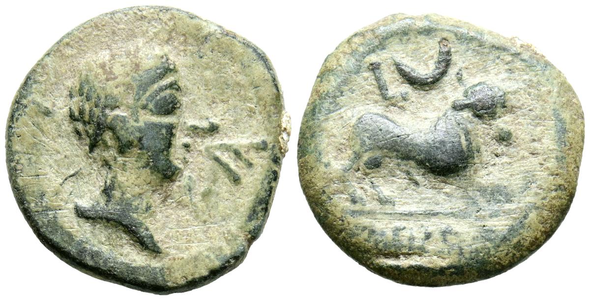 CARTAGONOVA (Cartagena, Murcia). As. (Ae. 10,10g/29mm). 27 a.C.-14 d.C. (FAB-577). Anv: Cabeza de Augusto laureado a derecha, alrededor leyenda: AVGVSTVS DIVI F. Rev: Aspérgilo, símpulo, segur y apex, alrededor leyenda: C VAR RVF SEX IVL POL II VOR Q. MBC-/MBC.