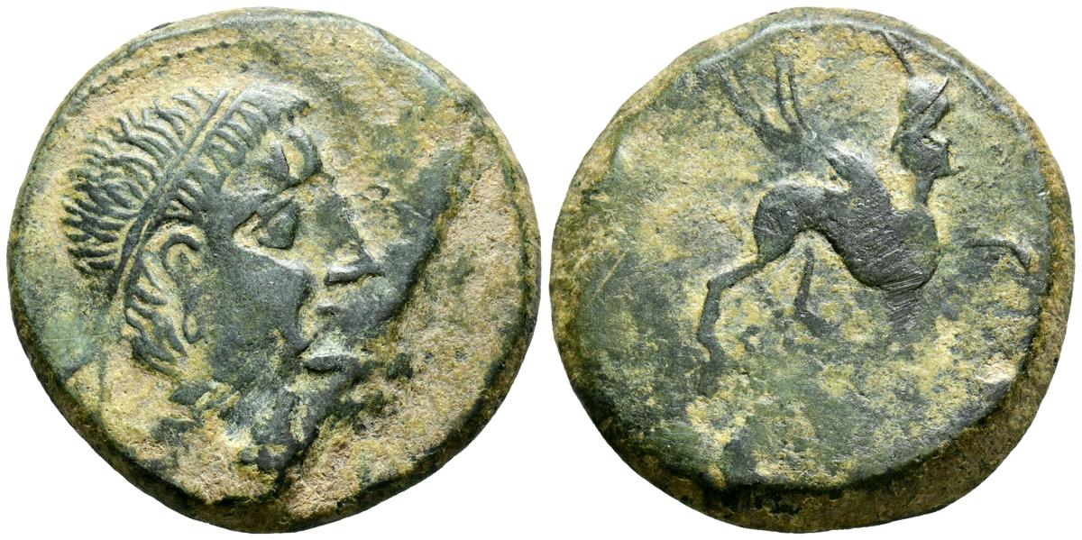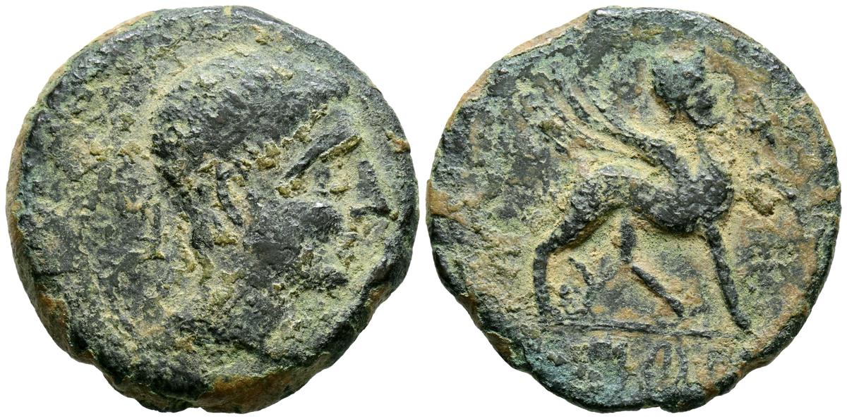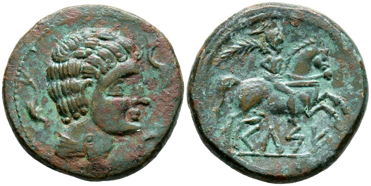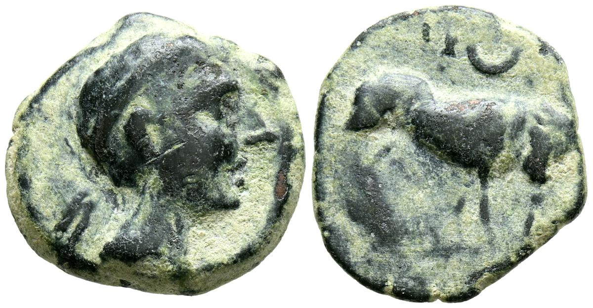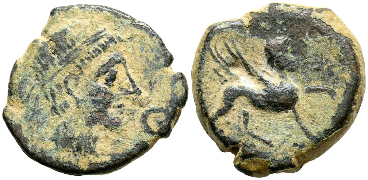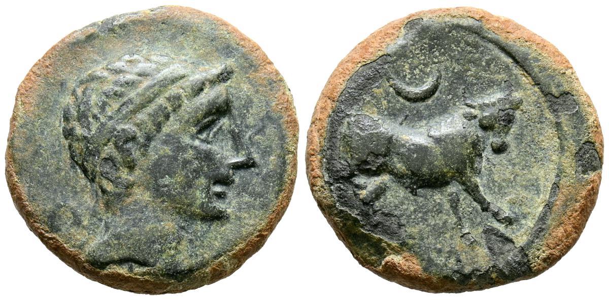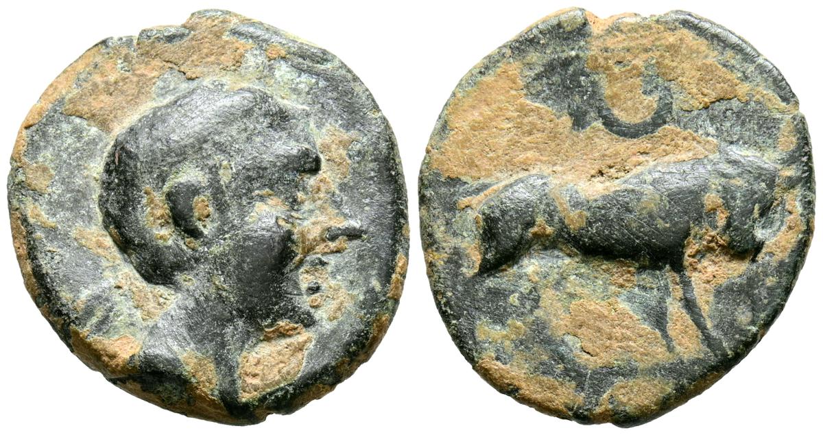 CARTAGONOVA (Cartagena, Murcia). As. (Ae. 10,10g/29mm). 27 a.C.-14 d.C. (FAB-577). Anv: Cabeza de Augusto laureado a derecha, alrededor leyenda: AVGVSTVS DIVI F. Rev: Aspérgilo, símpulo, segur y apex, alrededor leyenda: C VAR RVF SEX IVL POL II VOR Q. MBC-/MBC.