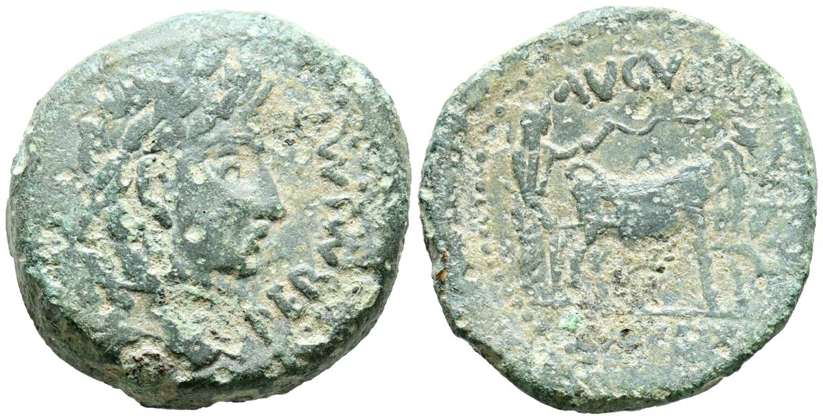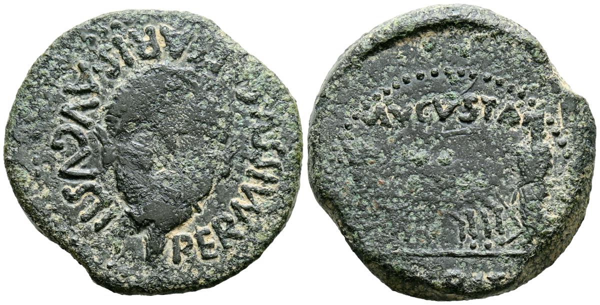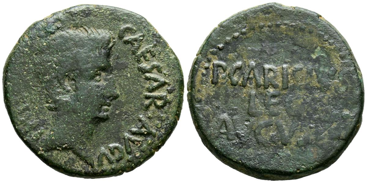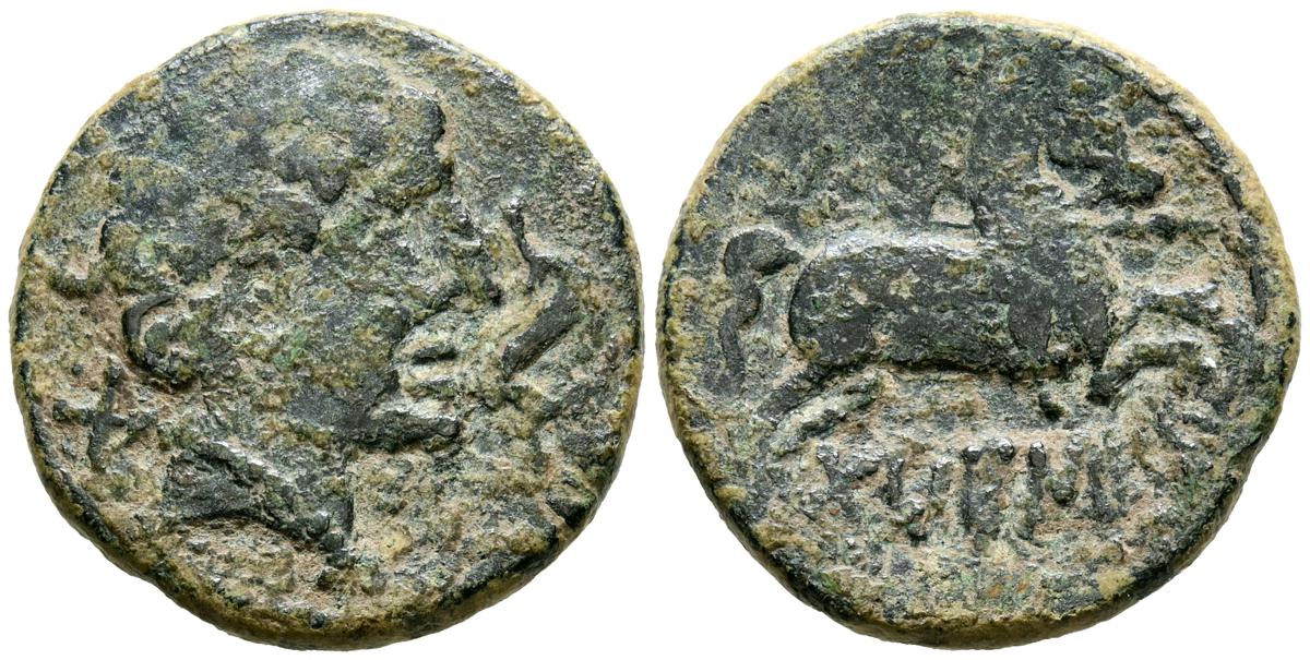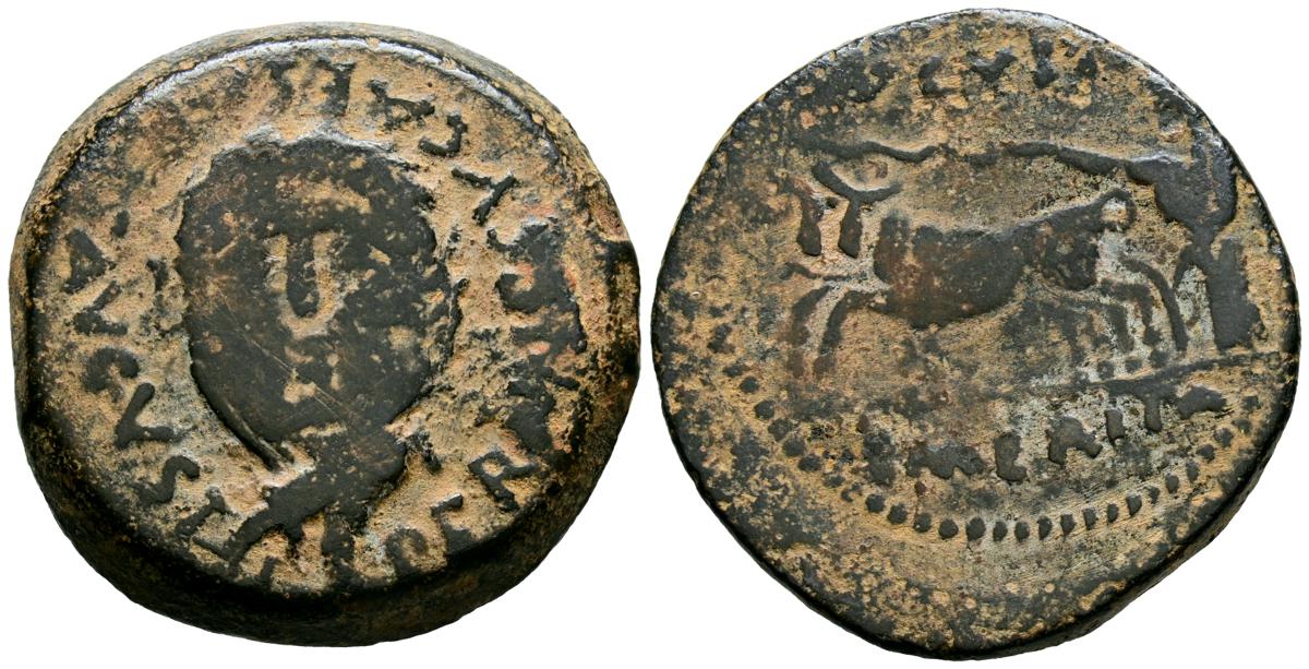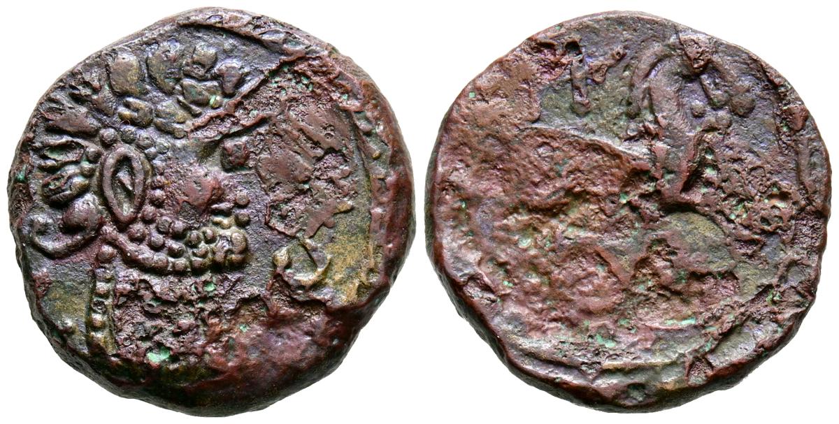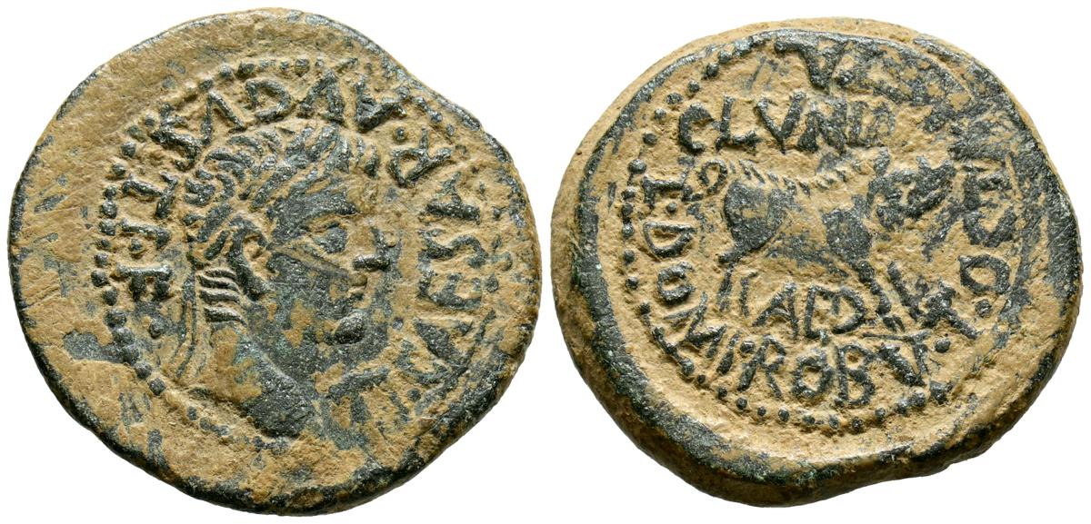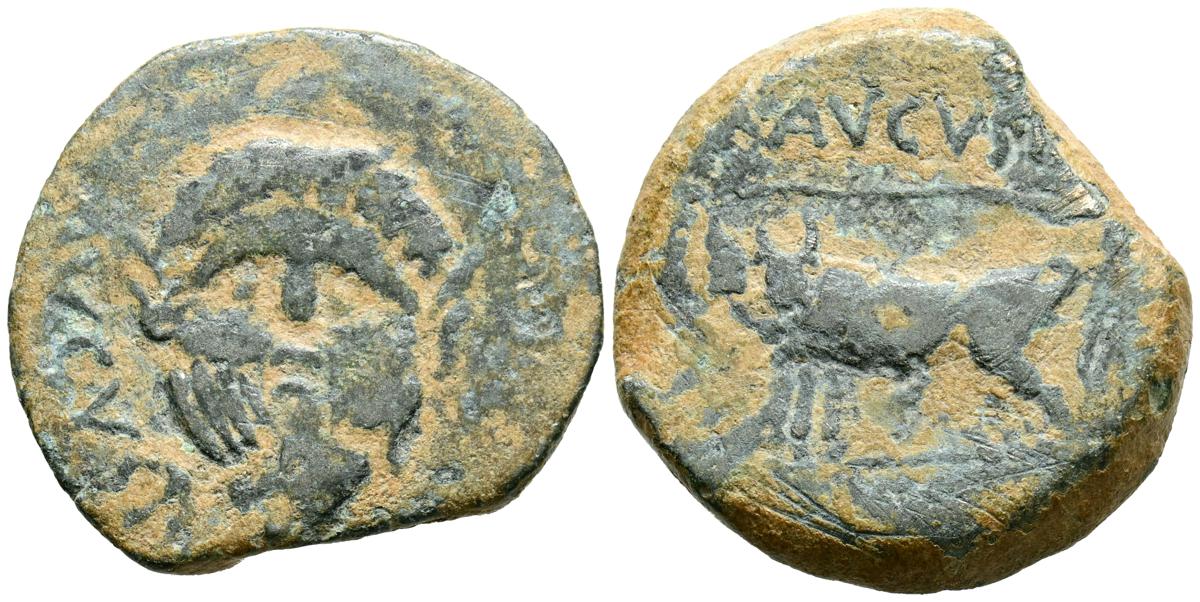 CELSE (Velilla del Ebro, Zaragoza). As. (Ae. 13,08g/29mm). 14-36 d.C. (FAB-819). Anv: Cabeza laureada de Tiberio a derecha, alrededor leyenda: TI CAESAR AVGVSTVS. Rev: Toro a derecha, encima leyenda: BACC FRONT, debajo: CN BVCCO, a la izquierda: D V I CEL, a la derecha: II VIR II. MBC-. Repatinado.