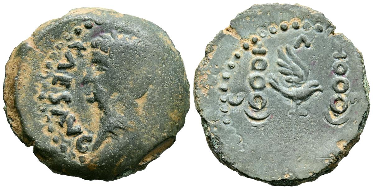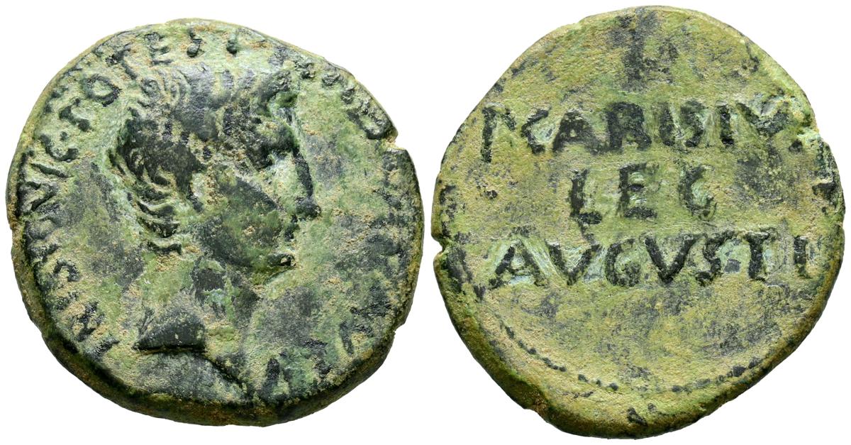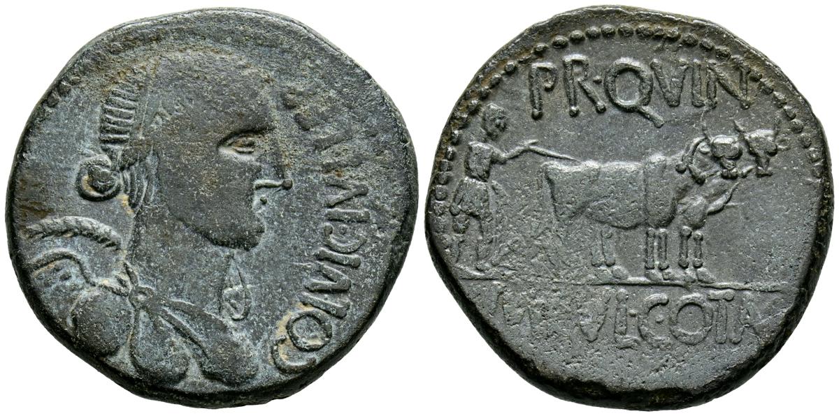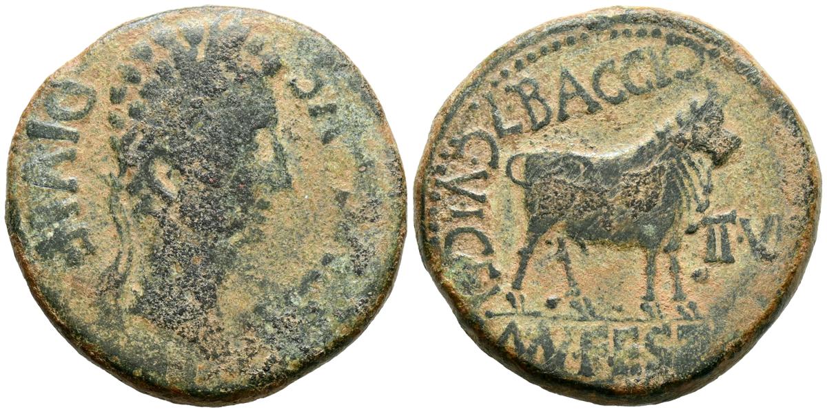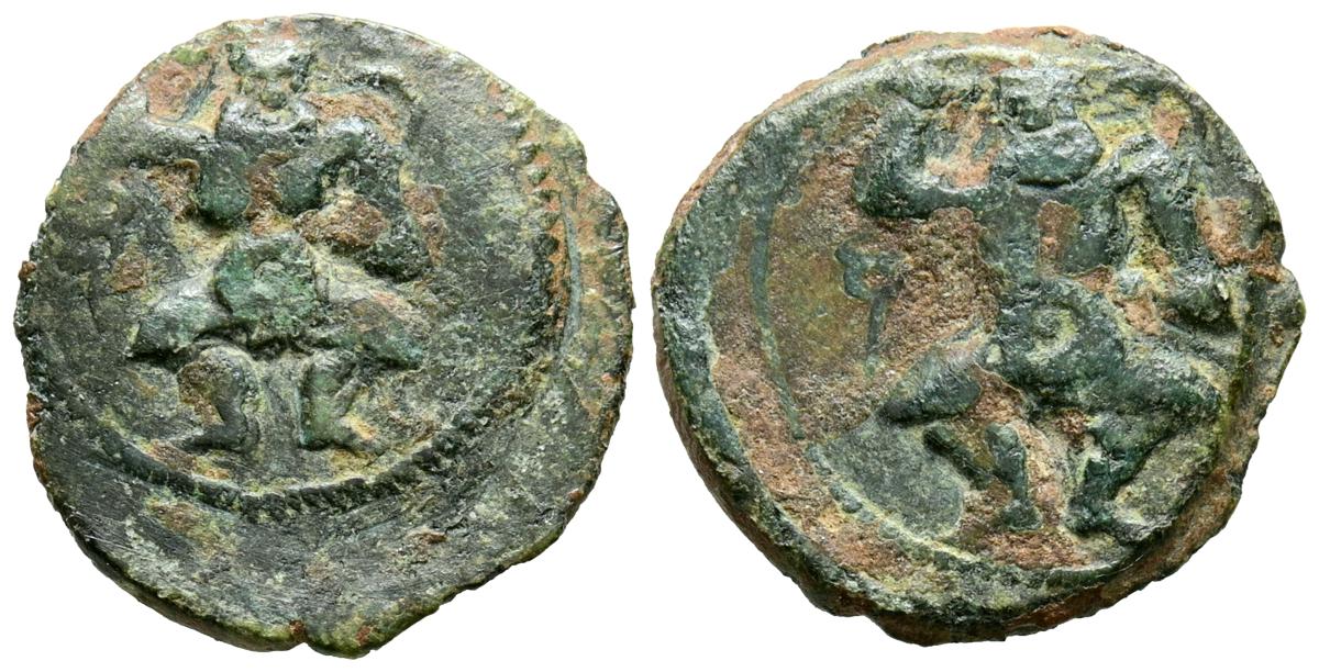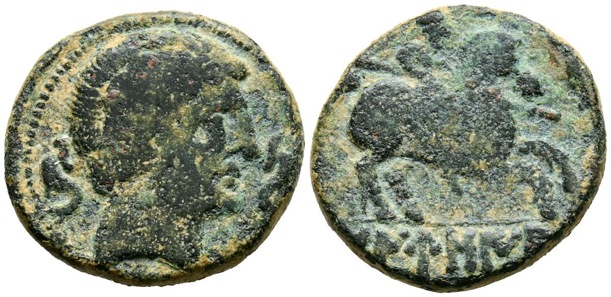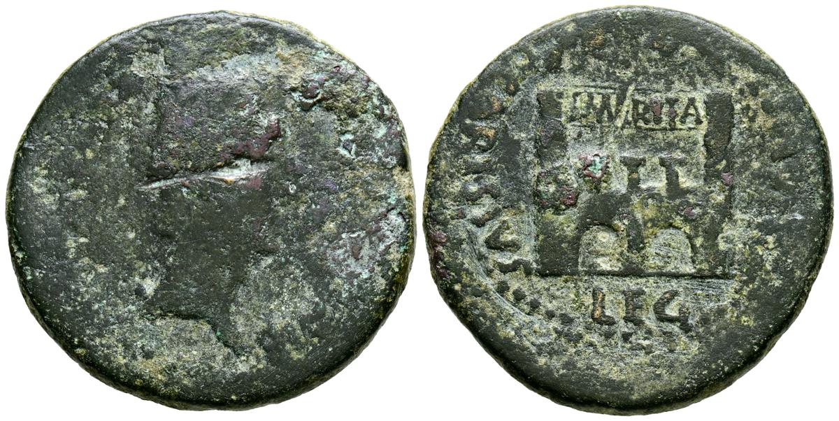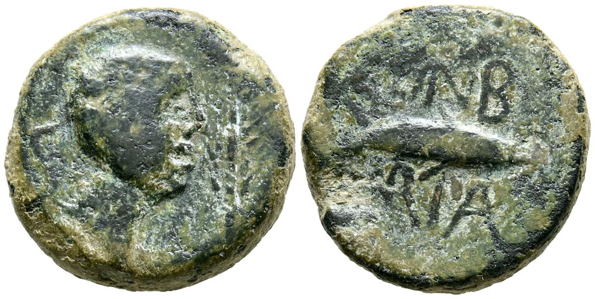 CELSE (Velilla del Ebro, Zaragoza). As. (Ae. 13,08g/29mm). 14-36 d.C. (FAB-819). Anv: Cabeza laureada de Tiberio a derecha, alrededor leyenda: TI CAESAR AVGVSTVS. Rev: Toro a derecha, encima leyenda: BACC FRONT, debajo: CN BVCCO, a la izquierda: D V I CEL, a la derecha: II VIR II. MBC-. Repatinado.