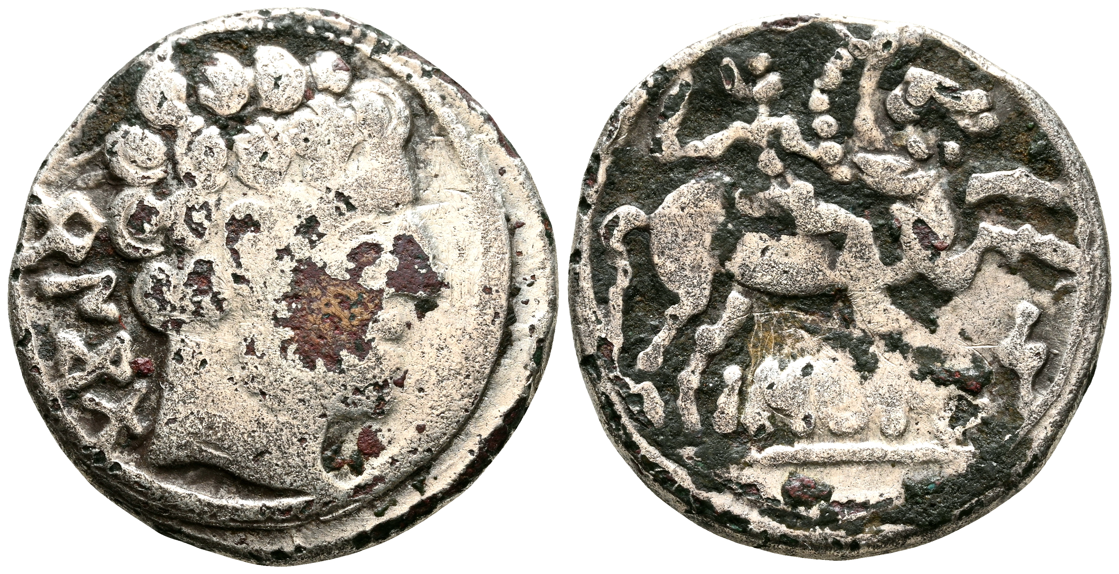 BASCUNES (Pamplona). Denario forrado (Ar-Ae. 3,53g/19mm). 120-20 a.C. (FAB-215). Anv: Cabeza masculina barbada a derecha, detrás leyenda ibérica BeNCoDa. Rev: Jinete con espada a derecha, debajo leyenda ibérica BaSCuNES. MBC-.