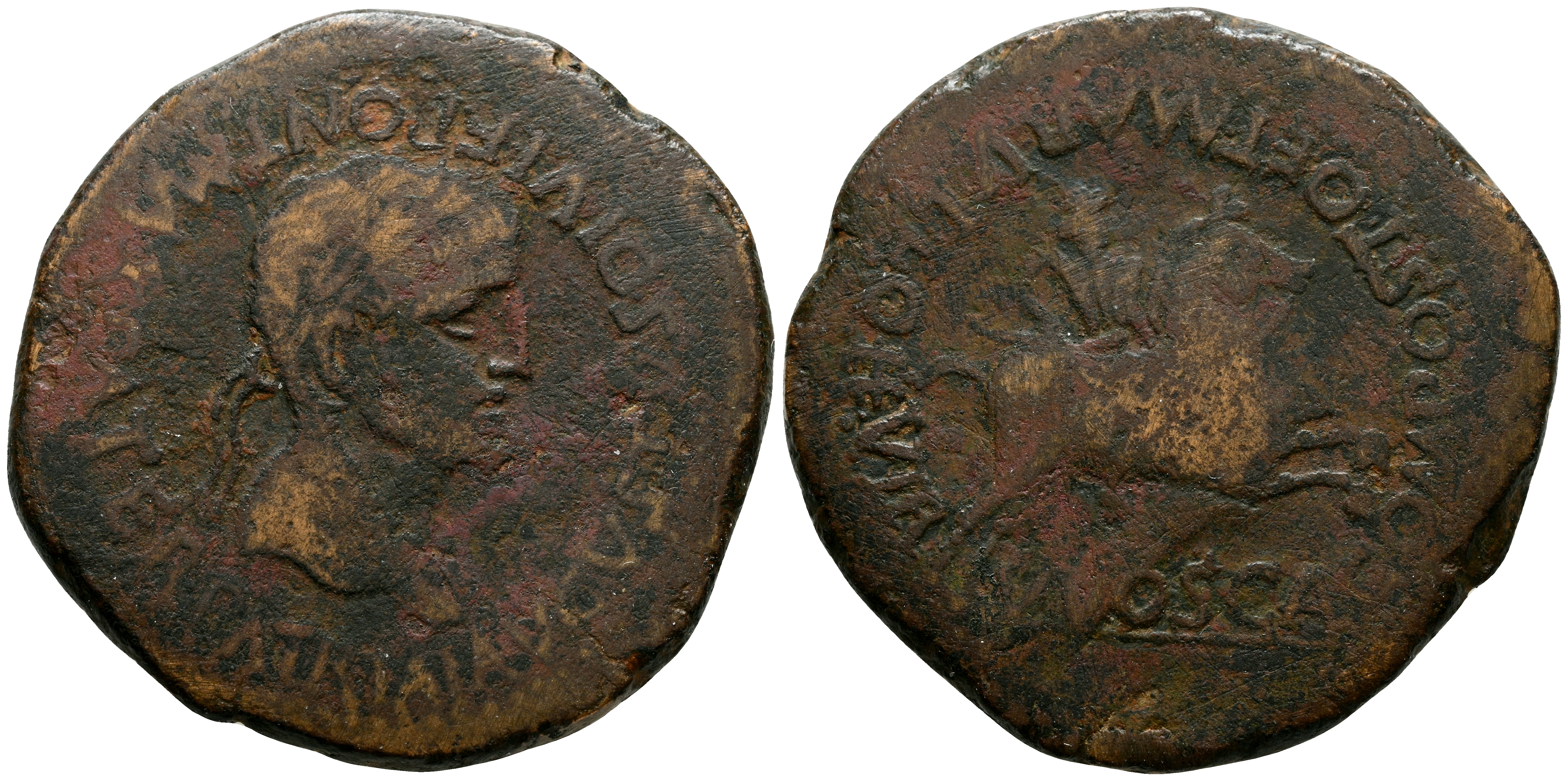 OSCA (Huesca). As. (Ae. 11,18g/28mm). 24 a.C.-14 d.C. (FAB-1929). Anv: Cabeza laureada de Augusto a derecha, alrededor leyenda: AVGVSTVS DIVI F PONT MAX PATER PATRIAE. Rev: Jinete con lanza a derecha, debajo: VV OSCA, alrededor leyenda: COMPOSTO ET MARVLLO II VIR. BC+. Rayitas.