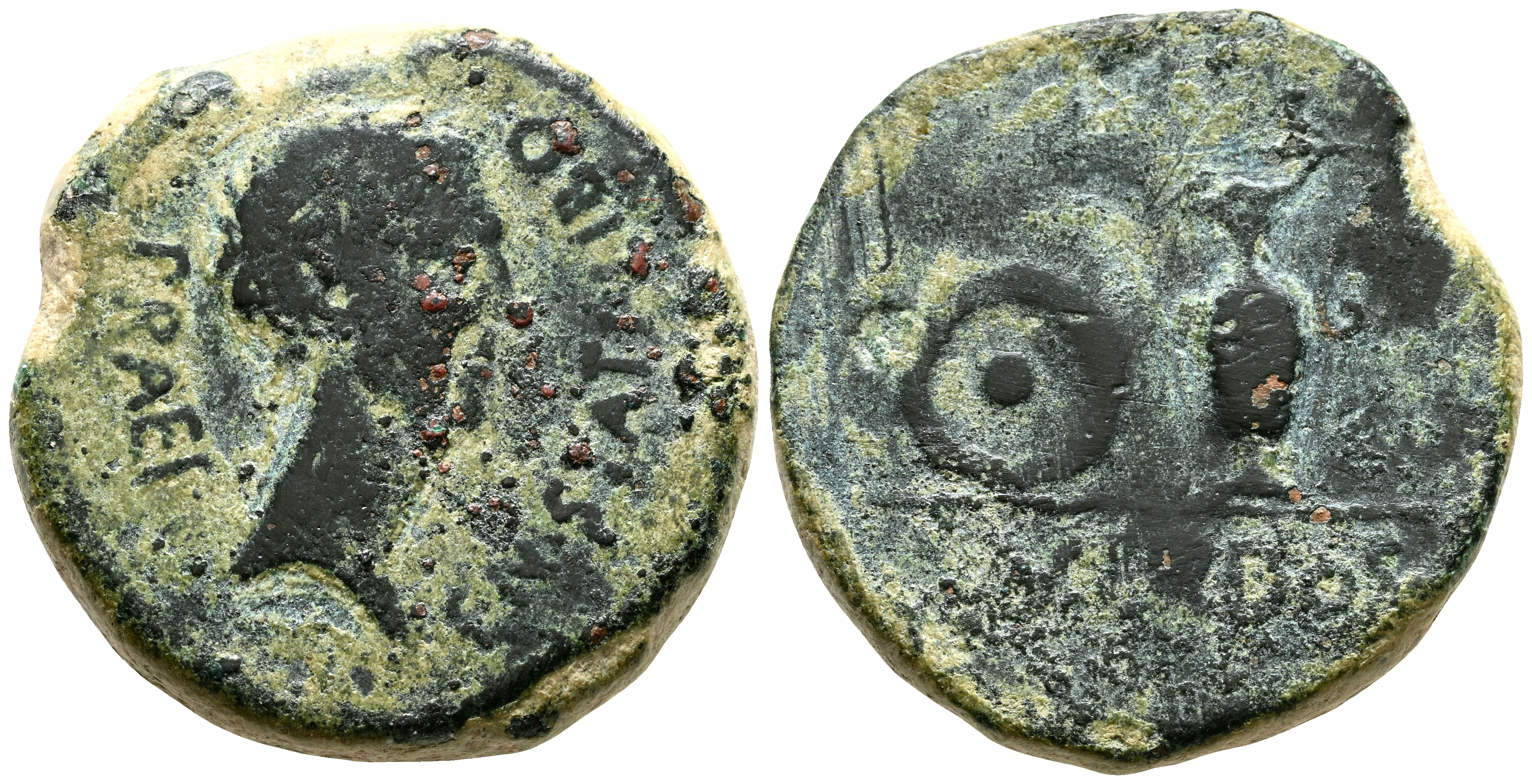CARTAGONOVA (Cartagena, Murcia). Semis. (Ae. 8,81g/22mm). 27 a.C.-14 d.C. (FAB-587). Anv: Cabeza de Agripa a derecha, alrededor leyenda: CN STATI LIBO PRAEF. Rev: Pátera y preferículo, debajo de línea leyenda: SACERDOS. BC+.