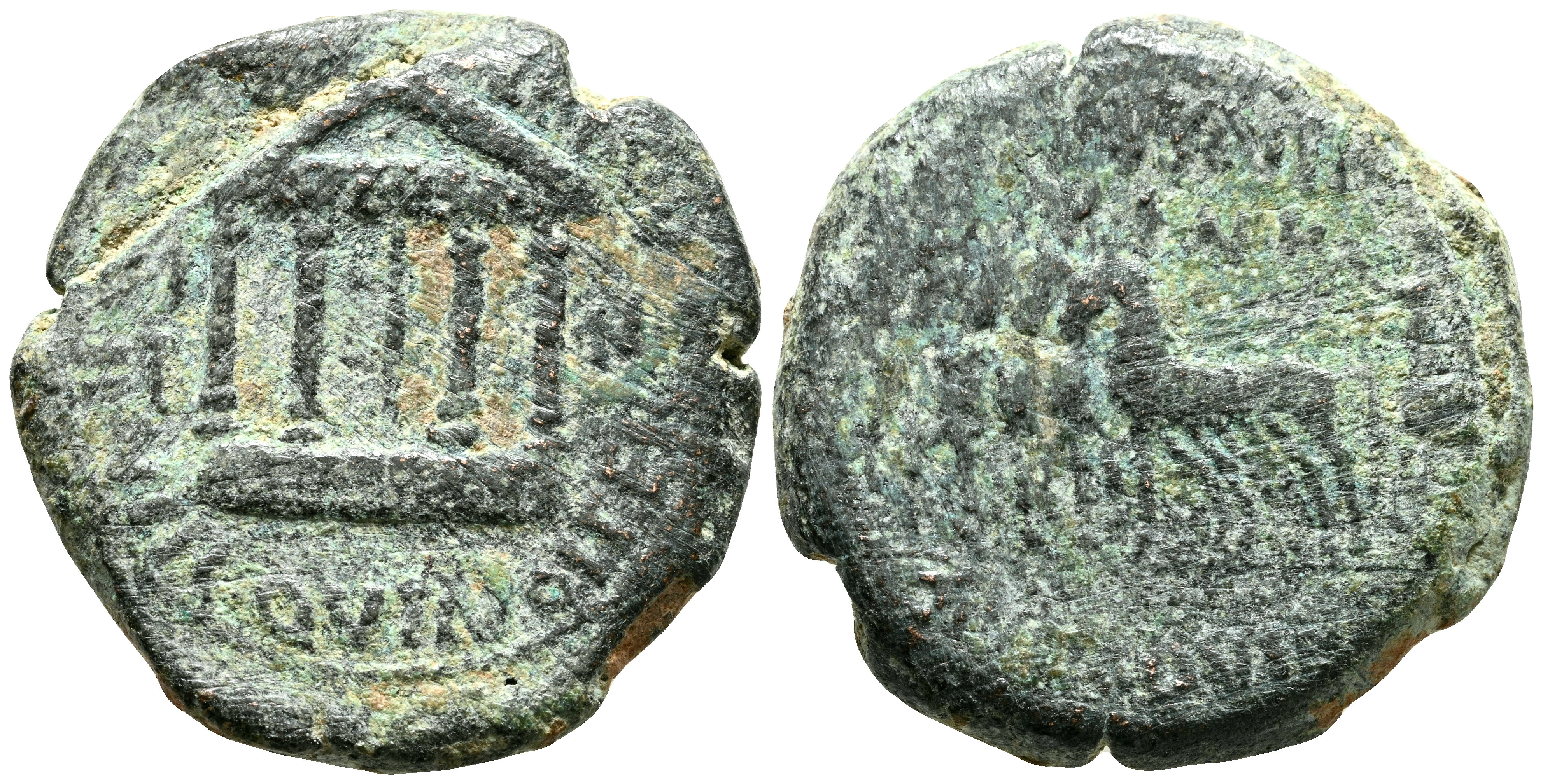 CARTAGONOVA (Cartagena, Murcia). Semis. (Ae. 6,96g/20mm). 14-36 d.C. (FAB-602). Anv: Templo tetrástilo con inscripción: AVGVSTO, entre: VI-NK, alrededor leyenda: M POSTV ALBINVS II VIR QVINQ ITER. Rev: Cuádriga a izquierda, delante vexilo, alrededor leyenda: P TVRVLLI VINK II VIR QVINQ ITER. MBC-.