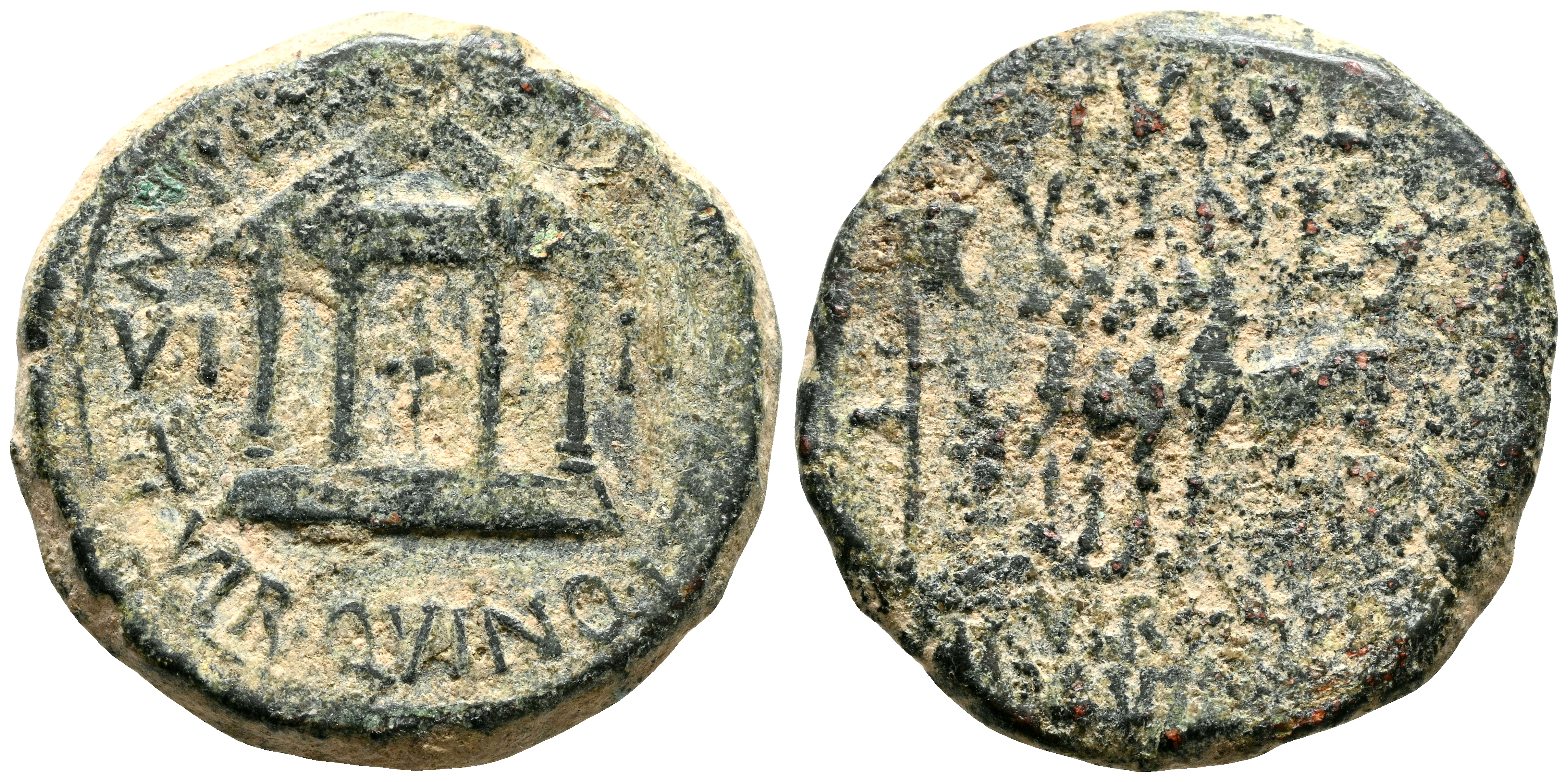 CARTAGONOVA (Cartagena, Murcia). Semis. (Ae. 4,87g/20mm). 14-36 d.C. (FAB-602). Anv: Templo tetrástilo con inscripción: AVGVSTO, entre: VI-NK, alrededor leyenda: M POSTV ALBINVS II VIR QVINQ ITER. Rev: Cuádriga a izquierda, delante vexilo, alrededor leyenda: P TVRVLLI VINK II VIR QVINQ ITER. MBC-.